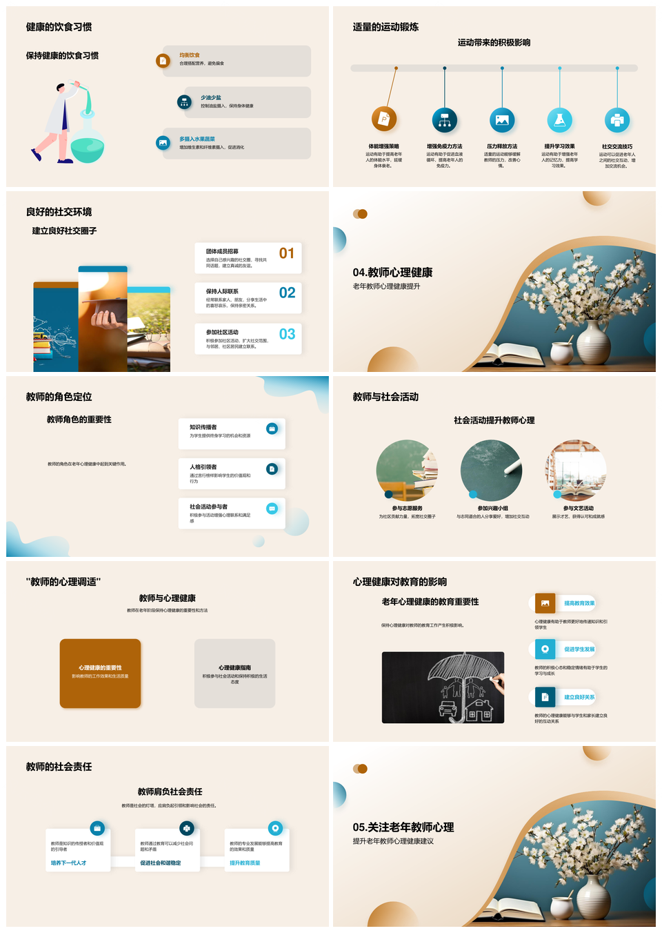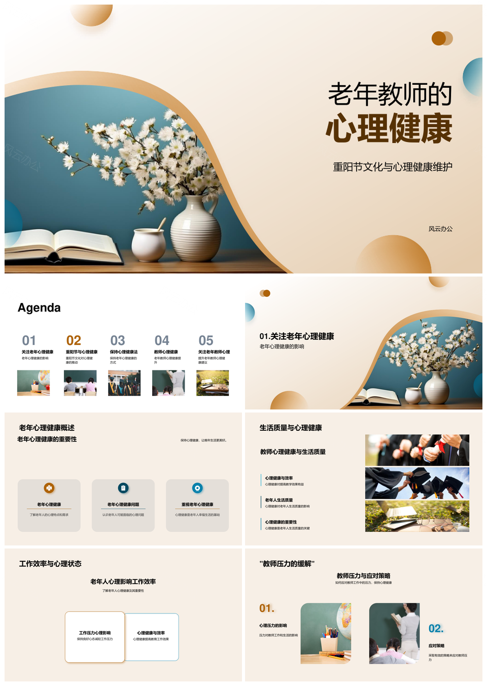 风云办公提供的老年教师心理健康与重阳教育培训活动PPT模板,下载格式为pptx,一共33页,作品中文字及图均可以修改和编辑,图片更改请在作品中右键图片并更换,文字修改请直接点击文字进行修改。