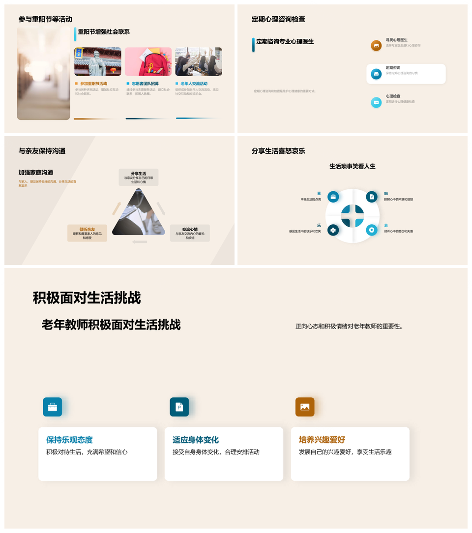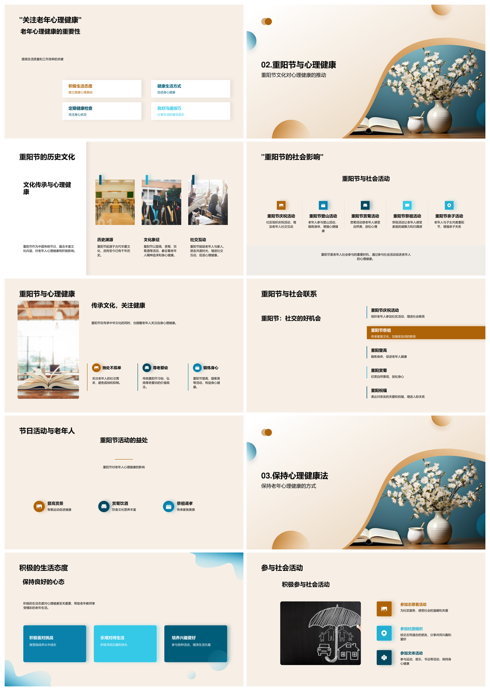 这是一张老年教师心理健康与重阳教育培训活动PPT模板,包含老年教师、心理健康、重阳教育、培训活动等主题内容,也可用作老年教师心理健康、老年教师培训活动、心理健康重阳教育、重阳教育培训活动、心理健康培训活动、老年教师重阳教育、心理培训活动、教师培训活动、培训活动心理健康、老年心理健康、教师心理健康、老年教师教育、心理健康教育、重阳教育培训、教师心理培训等PPT场景使用。