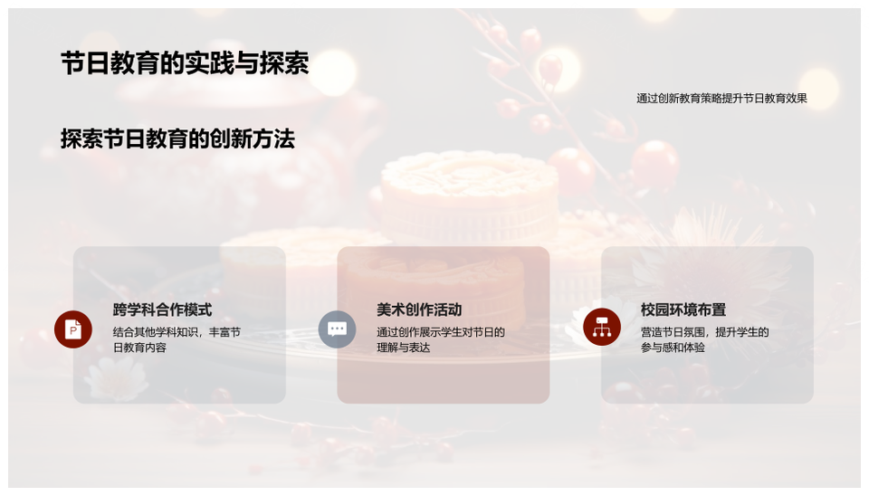 这是一张2025中秋美术教育跨科课程创作校园环境布置PPT模板,包含2025、中秋、美术教育、跨科课程、创作、校园环境、布置等主题内容,也可用作2025中秋美术教育跨科课程、中秋美术教育跨科课程创作、美术教育跨科课程创作校园环境布置、2025中秋跨科课程校园环境布置、中秋跨科课程创作校园环境布置、美术教育创作校园环境布置、2025中秋美术教育创作、中秋美术教育跨科课程、跨科课程创作校园环境布置、2025中秋校园环境布置、中秋跨科课程创作、美术教育跨科课程、跨科课程校园环境布置、中秋校园环境布置、校园环境布置创作等PPT场景使用。 风云办公提供的2025中秋美术教育跨科课程创作校园环境布置PPT模板,下载格式为pptx,一共29页,作品中文字及图均可以修改和编辑,图片更改请在作品中右键图片并更换,文字修改请直接点击文字进行修改。