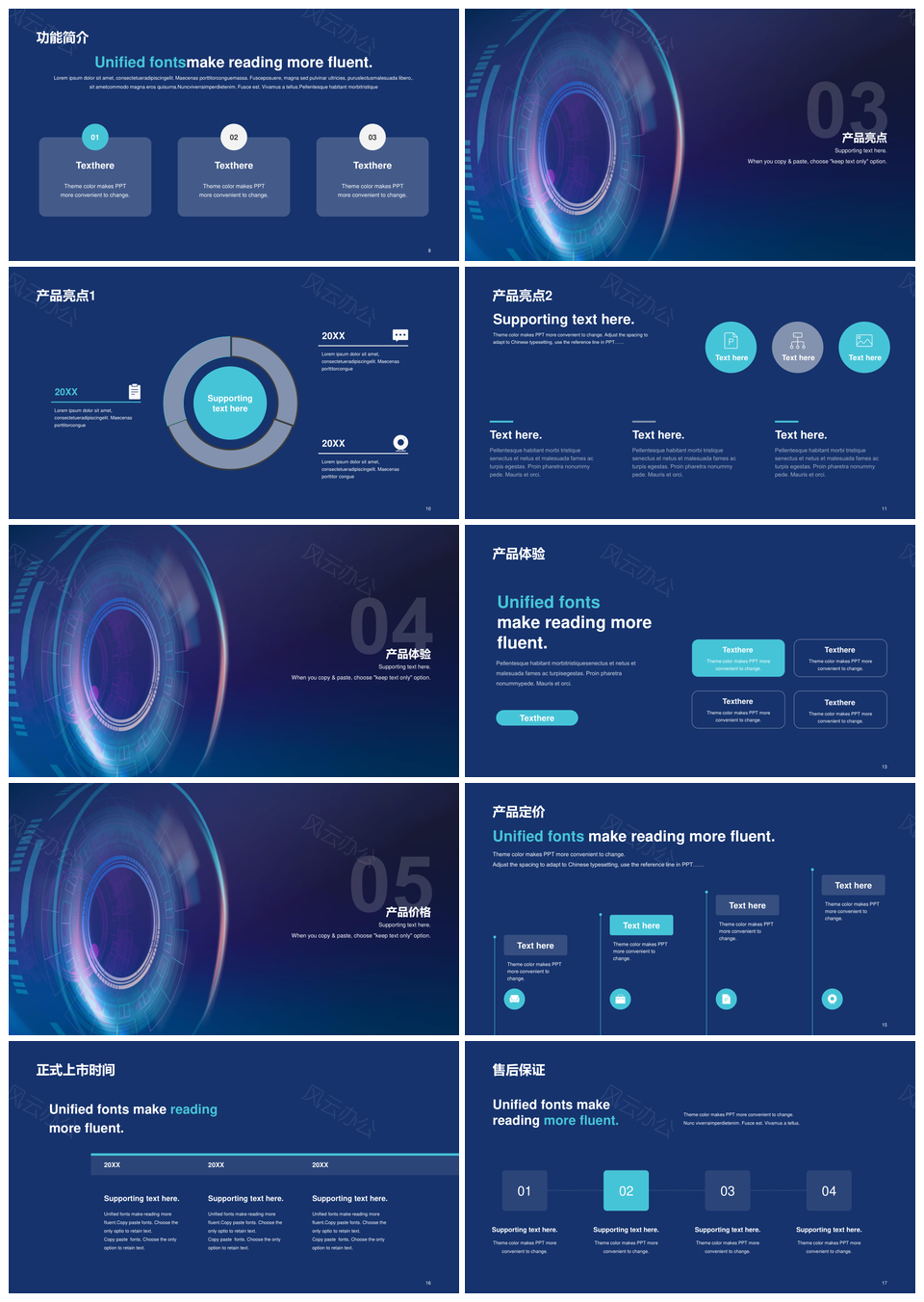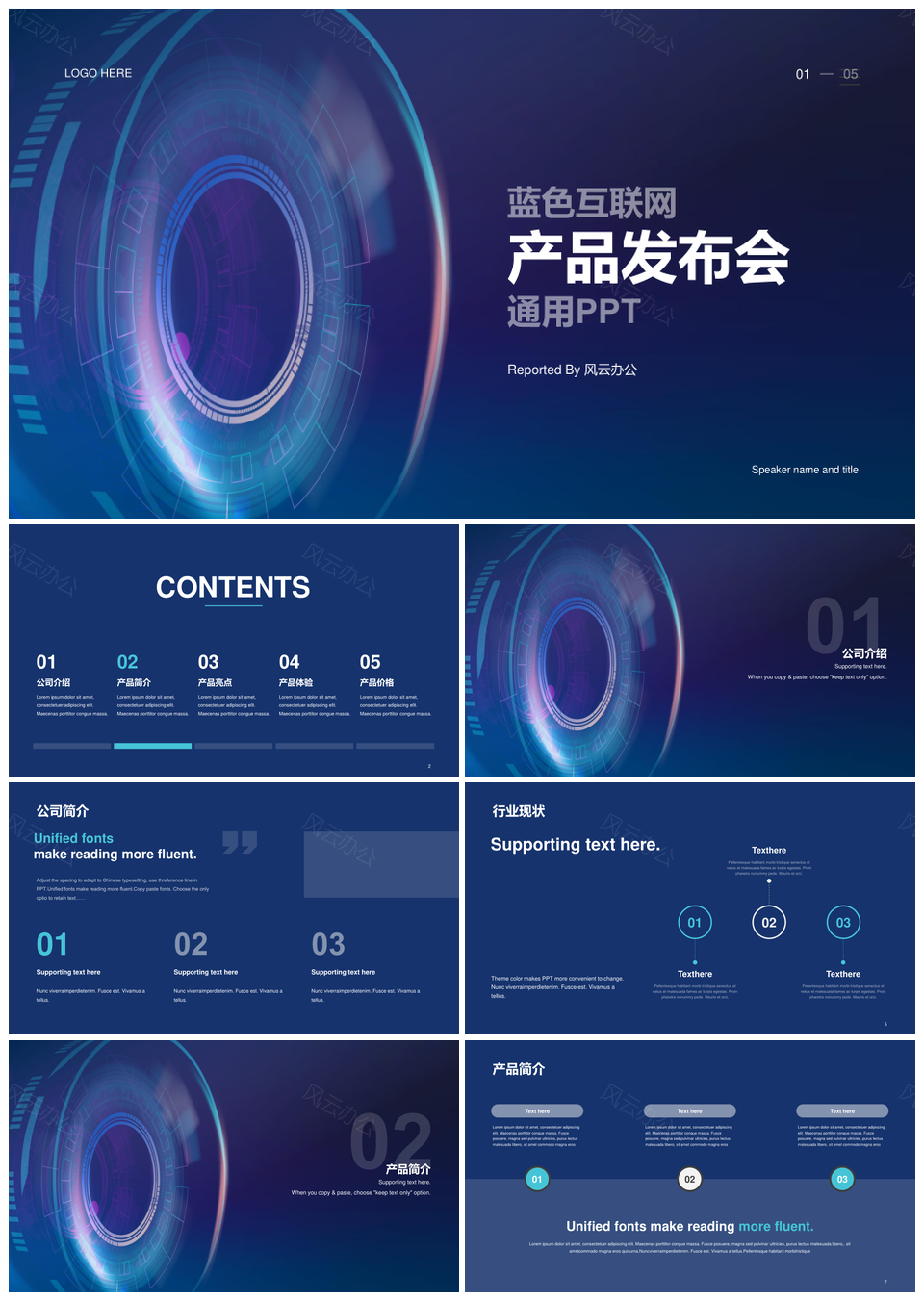 风云办公提供的蓝色炫酷科技互联网发布会PPT模板,下载格式为pptx,一共18页,作品中文字及图均可以修改和编辑,图片更改请在作品中右键图片并更换,文字修改请直接点击文字进行修改。