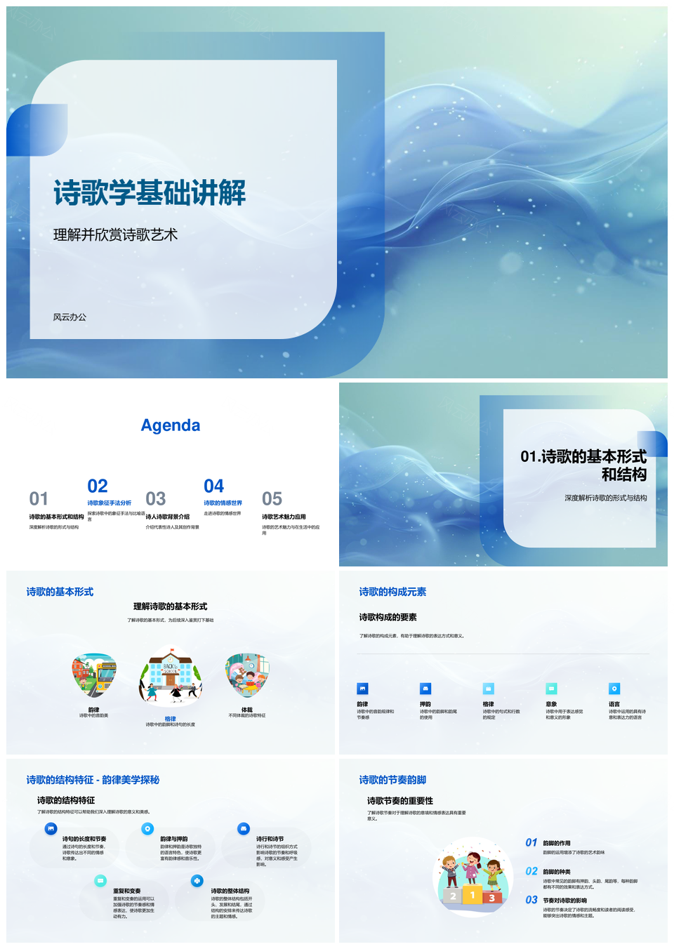 风云办公提供的诗歌艺术形式要素象征比喻解析PPT模板,下载格式为pptx,一共33页,作品中文字及图均可以修改和编辑,图片更改请在作品中右键图片并更换,文字修改请直接点击文字进行修改。