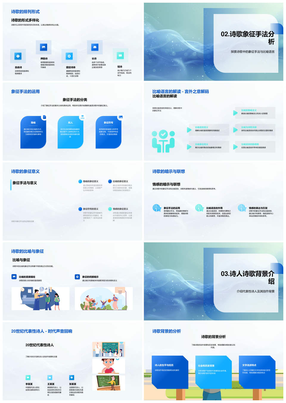 这是一张诗歌艺术形式要素象征比喻解析PPT模板,包含诗歌、艺术、形式、要素、象征、比喻、解析等主题内容,也可用作诗歌艺术形式要素、艺术形式要素象征、形式要素象征比喻、要素象征比喻解析、诗歌艺术形式、艺术形式要素、形式要素象征、要素象征比喻、象征比喻解析、诗歌艺术、艺术形式、形式要素、要素象征、象征比喻、比喻解析等PPT场景使用。