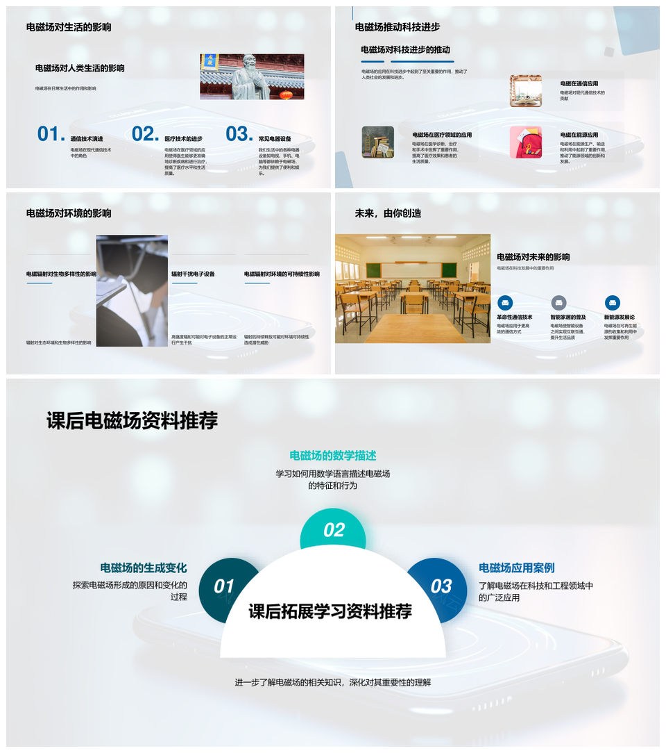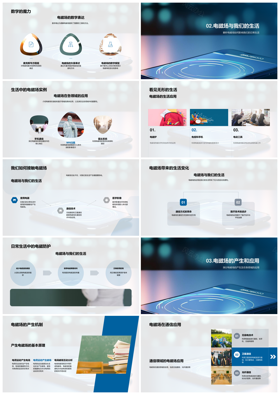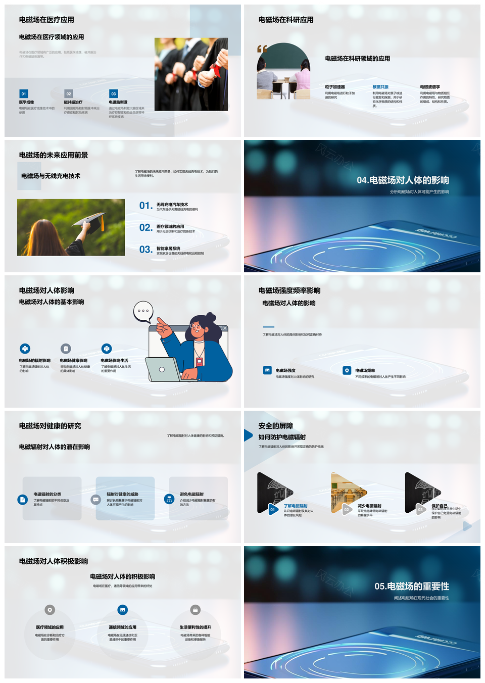 这是一张电磁场辐射通信医疗科技进步与生活人体影响PPT模板,包含电磁场、辐射、通信、医疗、科技、进步、生活、人体、影响等主题内容,也可用作电磁场辐射通信医疗、电磁场辐射通信科技、电磁场辐射医疗科技、电磁场通信医疗科技、辐射通信医疗科技、通信医疗科技进步、医疗科技进步生活、科技进步生活人体、科技生活人体影响、电磁场通信医疗进步、辐射医疗科技进步、电磁场科技生活人体、通信科技人体影响、医疗生活人体影响、科技进步人体影响等PPT场景使用。 风云办公提供的电磁场辐射通信医疗科技进步与生活人体影响PPT模板,下载格式为pptx,一共33页,作品中文字及图均可以修改和编辑,图片更改请在作品中右键图片并更换,文字修改请直接点击文字进行修改。