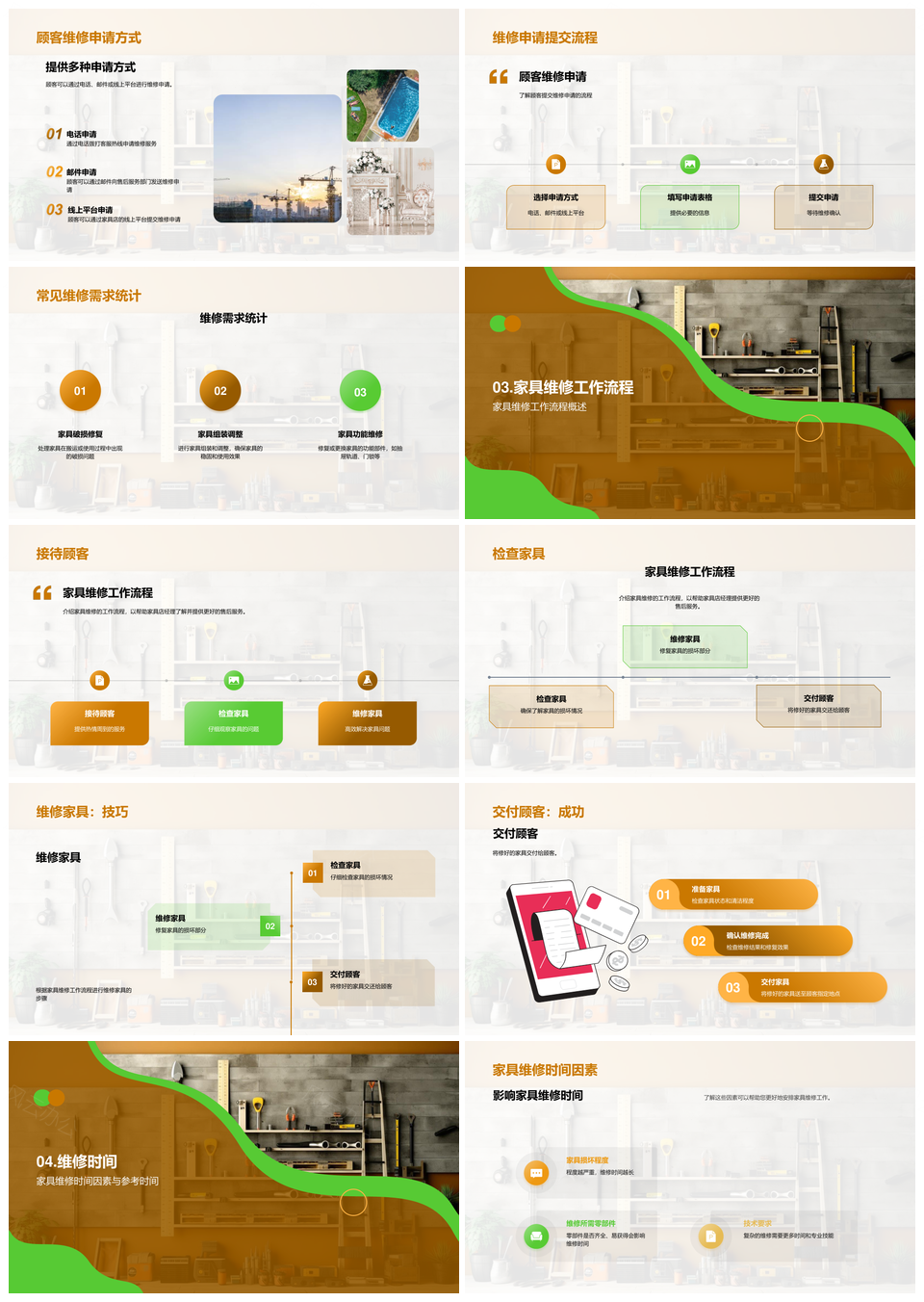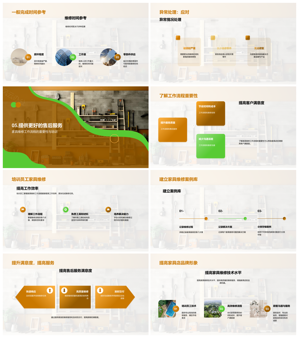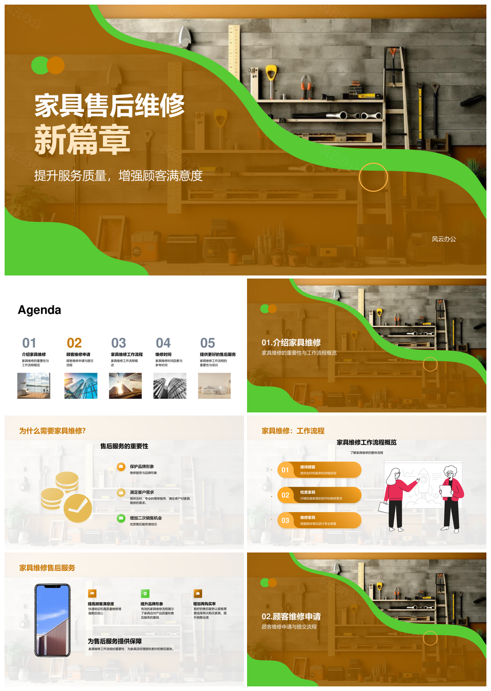 这是一张家具店售后维修工作流程及顾客电话邮件申请PPT模板,包含家具店、售后、维修、工作流程、顾客、电话、邮件、申请等主题内容,也可用作家具店售后维修工作流程、顾客电话邮件申请、家具店售后维修、售后维修工作流程、顾客电话邮件、电话邮件申请、家具店售后、售后维修、顾客电话、电话邮件、邮件申请、维修工作流程、工作流程顾客、售后顾客、顾客申请等PPT场景使用。 风云办公提供的家具店售后维修工作流程及顾客电话邮件申请PPT模板,下载格式为pptx,一共26页,作品中文字及图均可以修改和编辑,图片更改请在作品中右键图片并更换,文字修改请直接点击文字进行修改。