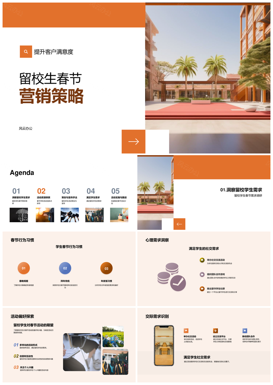 风云办公提供的留校生春节校园营销需求与宣传策略PPT模板,下载格式为pptx,一共33页,作品中文字及图均可以修改和编辑,图片更改请在作品中右键图片并更换,文字修改请直接点击文字进行修改。