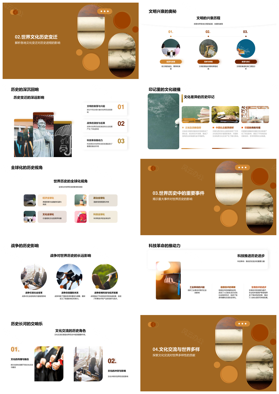 这是一张人类文明兴衰史迹古今交流PPT模板,包含人类文明、兴衰、史迹、古今、交流等主题内容,也可用作人类文明兴衰史迹、文明兴衰史迹古今、兴衰史迹古今交流、人类文明兴衰、文明兴衰史迹、兴衰史迹古今、史迹古今交流、人类文明、文明兴衰、兴衰史迹、史迹古今、古今交流、人类兴衰、文明史迹、文明古今等PPT场景使用。 风云办公提供的人类文明兴衰史迹古今交流PPT模板,下载格式为pptx,一共25页,作品中文字及图均可以修改和编辑,图片更改请在作品中右键图片并更换,文字修改请直接点击文字进行修改。
