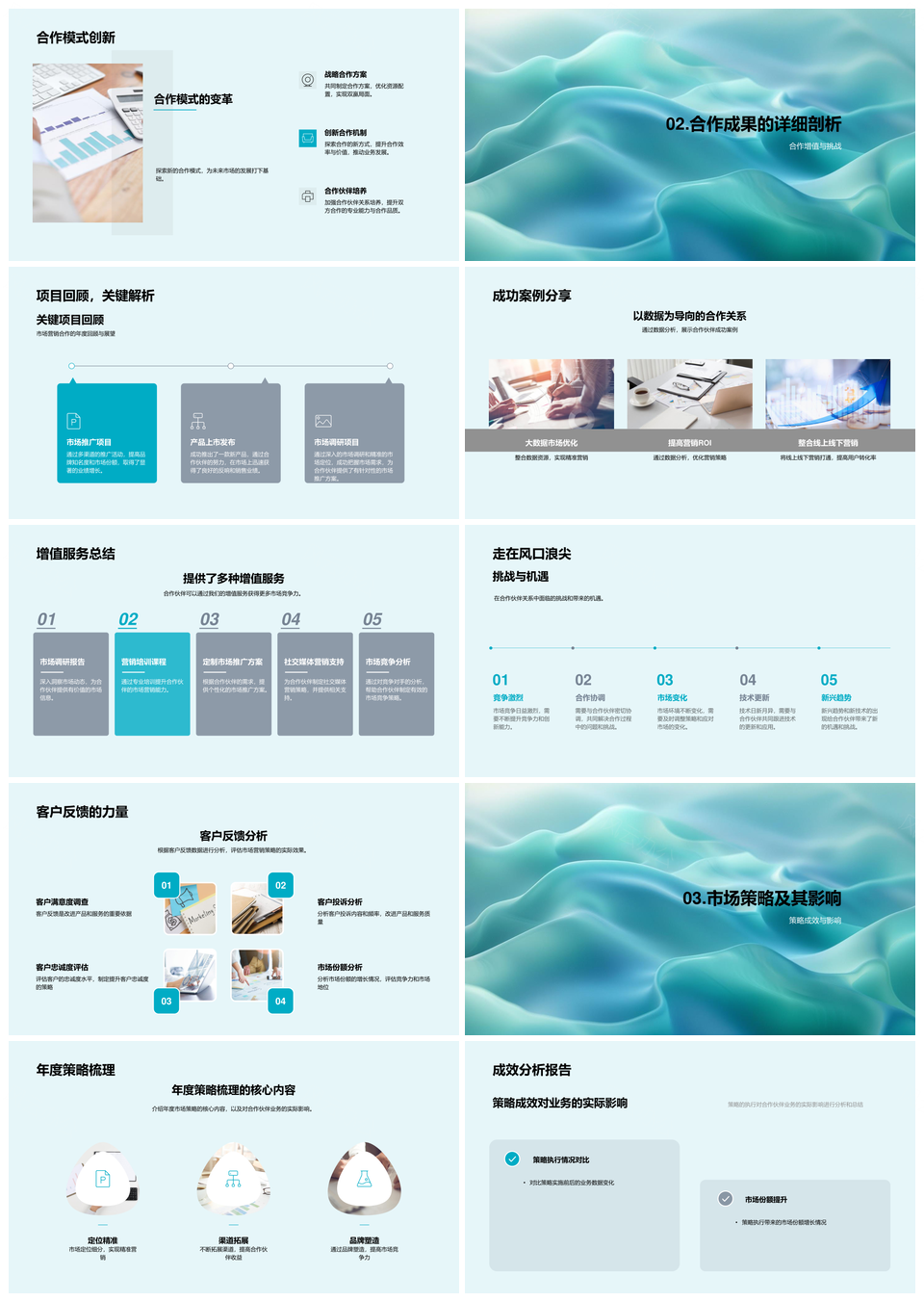 这是一张2025合作伙伴视角年度营销成果趋势创新案例增值总结PPT模板,包含2025、合作伙伴、视角、年度、营销、成果、趋势、创新、案例、增值、总结等主题内容,也可用作2025合作伙伴视角年度、合作伙伴视角年度营销、视角年度营销成果、年度营销成果趋势、营销成果趋势创新、成果趋势创新案例、趋势创新案例增值、创新案例增值总结、合作伙伴年度营销成果、年度营销趋势创新案例、营销成果增值总结、趋势创新增值总结、合作伙伴案例增值、成果案例增值总结、营销创新增值案例等PPT场景使用。 风云办公提供的2025合作伙伴视角年度营销成果趋势创新案例增值总结PPT模板,下载格式为pptx,一共33页,作品中文字及图均可以修改和编辑,图片更改请在作品中右键图片并更换,文字修改请直接点击文字进行修改。