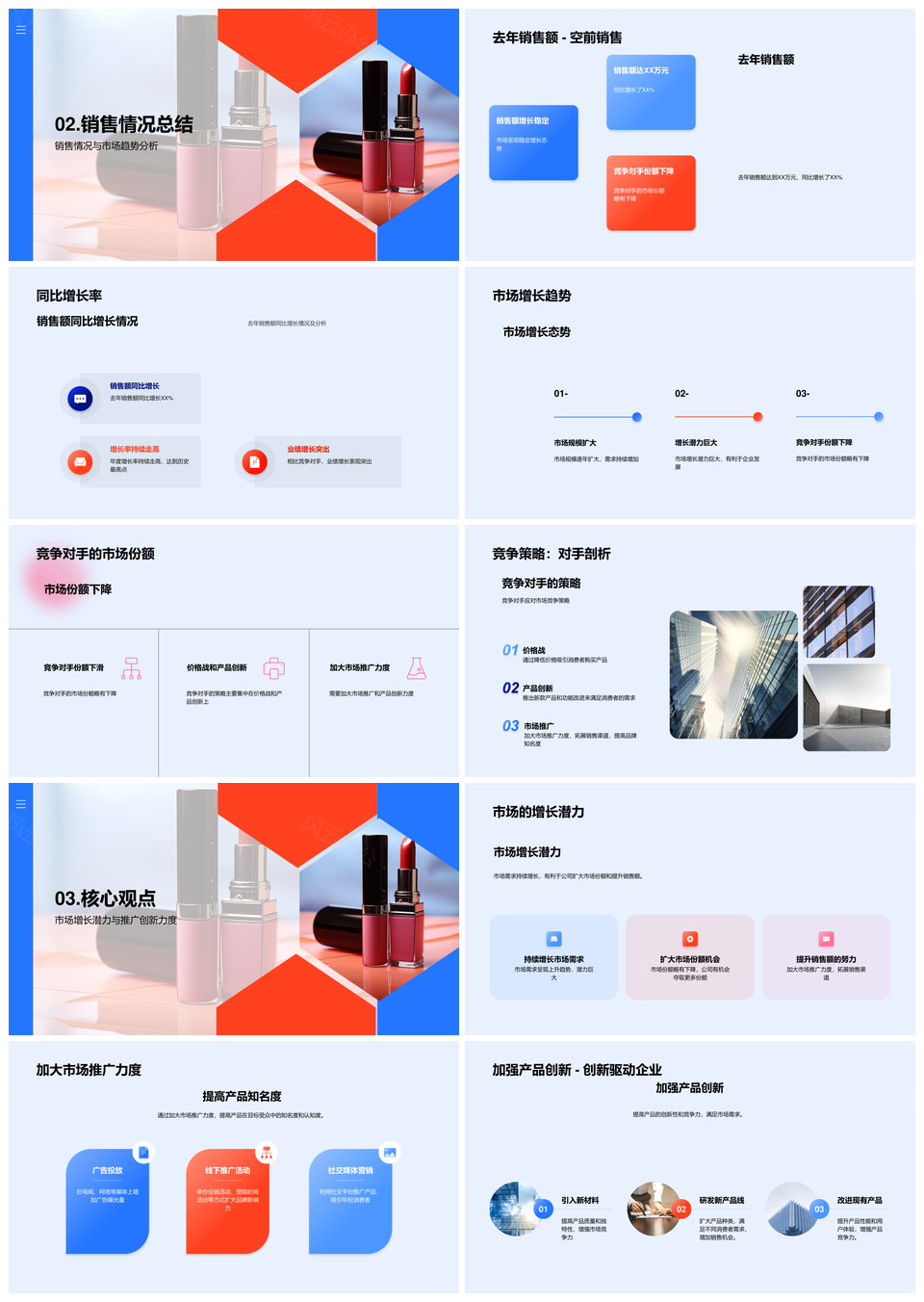 这是一张时尚化妆品批发销售经理年度总结市场趋势竞争动态PPT模板,包含时尚化妆品、批发销售、经理、年度总结、市场趋势、竞争等主题内容,也可用作时尚化妆品批发销售经理、化妆品批发销售经理年度总结、批发销售经理年度总结市场趋势、销售经理年度总结市场趋势竞争动态、时尚化妆品批发、化妆品批发销售经理、批发销售经理年度总结、销售经理年度总结市场趋势、年度总结市场趋势竞争动态、时尚化妆品、化妆品批发、批发销售经理、销售经理年度总结、年度总结市场趋势、市场趋势竞争动态等PPT场景使用。 风云办公提供的时尚化妆品批发销售经理年度总结市场趋势竞争动态PPT模板,下载格式为pptx,一共24页,作品中文字及图均可以修改和编辑,图片更改请在作品中右键图片并更换,文字修改请直接点击文字进行修改。