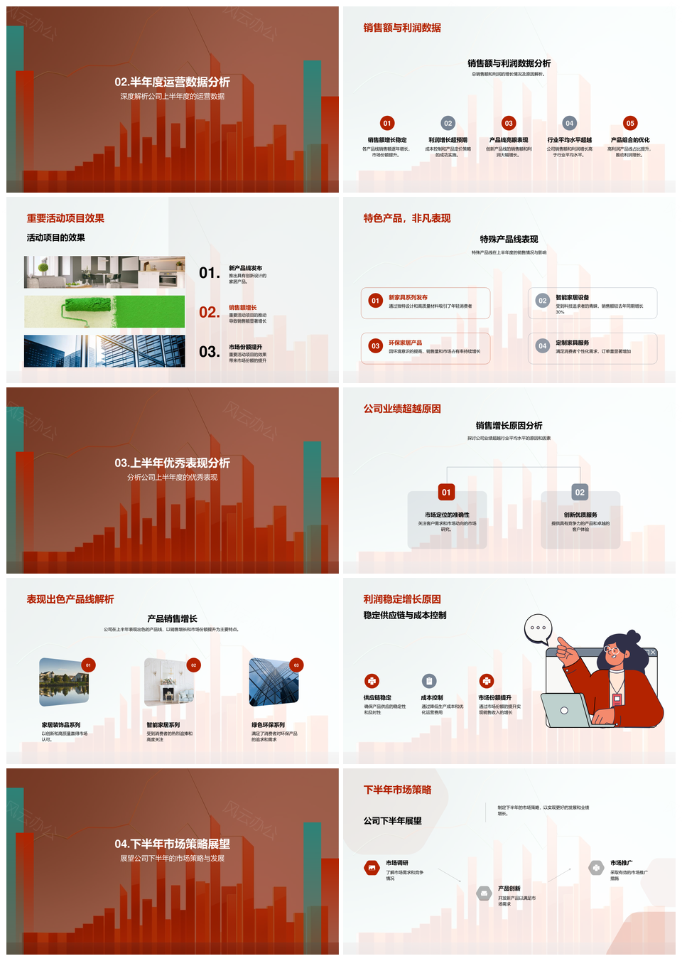这是一张家居行业半年运营数据策略销售利润产品线表现PPT模板,包含家居行业、半年、运营数据、策略、销售、利润、产品线、表现等主题内容,也可用作家居行业半年运营数据策略、半年运营数据策略销售、运营数据策略销售利润、数据策略销售利润产品线、策略销售利润产品线表现、家居行业半年运营数据、半年运营数据销售利润、运营数据策略销售利润、数据策略销售产品线、策略销售利润产品线、销售利润产品线表现、家居行业数据策略、半年运营策略销售、数据策略产品线表现、家居行业销售利润等PPT场景使用。 风云办公提供的家居行业半年运营数据策略销售利润产品线表现PPT模板,下载格式为pptx,一共24页,作品中文字及图均可以修改和编辑,图片更改请在作品中右键图片并更换,文字修改请直接点击文字进行修改。