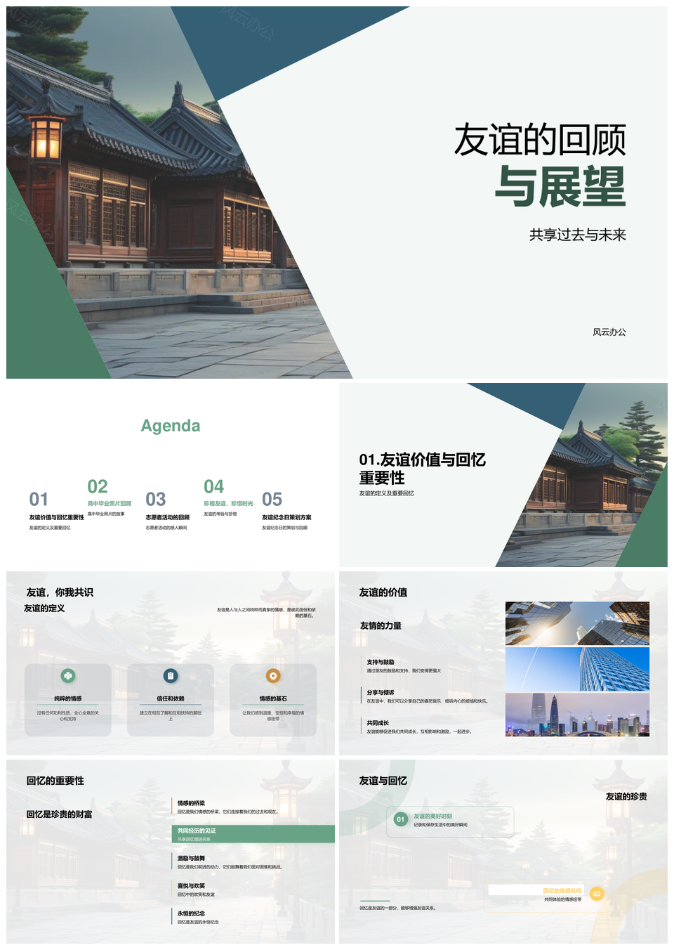 本模板以中国风古建筑为视觉基调,融合青砖黛瓦、灯笼元素与石板路纹理,营造出静谧雅致的东方韵味。主色调选用水墨绿、靛蓝与素白,平衡传统意境与现代商务需求。几何模块化版式参考波粒二象性概念,通过激光光束线条与光效粒子动态塑造科技感,实现传统文化符号与前沿科研主题的无缝衔接。自适应图表组件支持复杂数据可视化,内置22组可编辑古风icon及光效粒子素材,适用于学术汇报、科技发布会及文化类方案展示,兼具专业表达与文化传承价值。