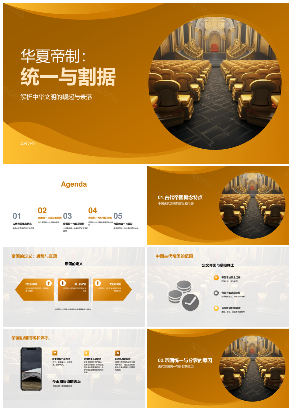 风云办公提供的高一华夏帝王统一分裂史鉴PPT模板,下载格式为pptx,一共24页,作品中文字及图均可以修改和编辑,图片更改请在作品中右键图片并更换,文字修改请直接点击文字进行修改。