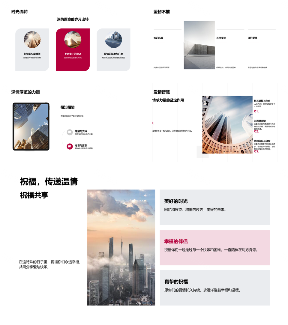 这是一张夫妻成长见证婚庆纪念爱情相册甜蜜岁月PPT模板,包含夫妻、成长、见证、婚庆、纪念、爱情、相册、甜蜜、岁月等主题内容,也可用作夫妻成长见证婚庆、婚庆纪念爱情相册、爱情相册甜蜜岁月、成长见证婚庆纪念、夫妻婚庆纪念相册、婚庆爱情相册岁月、夫妻纪念爱情相册、成长婚庆纪念相册、见证婚庆爱情相册、纪念爱情甜蜜岁月、夫妻成长婚庆、婚庆纪念爱情、爱情相册岁月、夫妻成长见证、甜蜜岁月见证、婚庆纪念相册、夫妻爱情相册、纪念爱情岁月、见证婚庆纪念、婚庆甜蜜岁月、爱情甜蜜相册、成长婚庆纪念、夫妻纪念相册、婚庆爱情岁月、见证爱情相册等PPT场景使用。 风云办公提供的夫妻成长见证婚庆纪念爱情相册甜蜜岁月PPT模板,下载格式为pptx,一共33页,作品中文字及图均可以修改和编辑,图片更改请在作品中右键图片并更换,文字修改请直接点击文字进行修改。