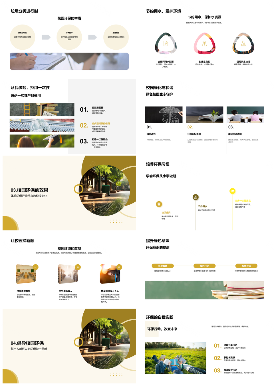 风云办公提供的绿色校园环保垃圾分类节约用水习惯PPT模板,下载格式为pptx,一共24页,作品中文字及图均可以修改和编辑,图片更改请在作品中右键图片并更换,文字修改请直接点击文字进行修改。