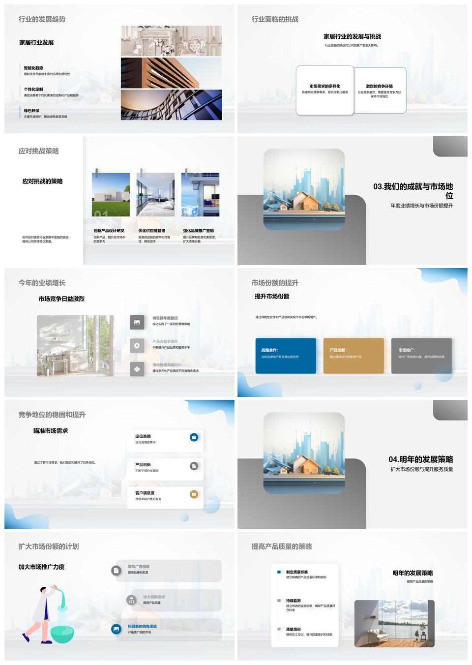 这是一张家居行业理念提升份额竞地位质优房趋势业绩应对挑战PPT模板,包含家居行业、理念、提升、份额、竞地位、质优房、趋势、业绩、应对、挑战等主题内容,也可用作家居行业理念提升份额、家居行业应对挑战趋势、提升份额应对挑战、质优房趋势应对挑战、应对挑战提升业绩、趋势业绩应对挑战、理念提升质优房、提升份额竞地位、质优房趋势业绩、家居行业提升份额、竞地位应对挑战、趋势应对挑战业绩、质优房趋势提升、家居行业竞地位、提升质优房业绩等PPT场景使用。 风云办公提供的家居行业理念提升份额竞地位质优房趋势业绩应对挑战PPT模板,下载格式为pptx,一共23页,作品中文字及图均可以修改和编辑,图片更改请在作品中右键图片并更换,文字修改请直接点击文字进行修改。