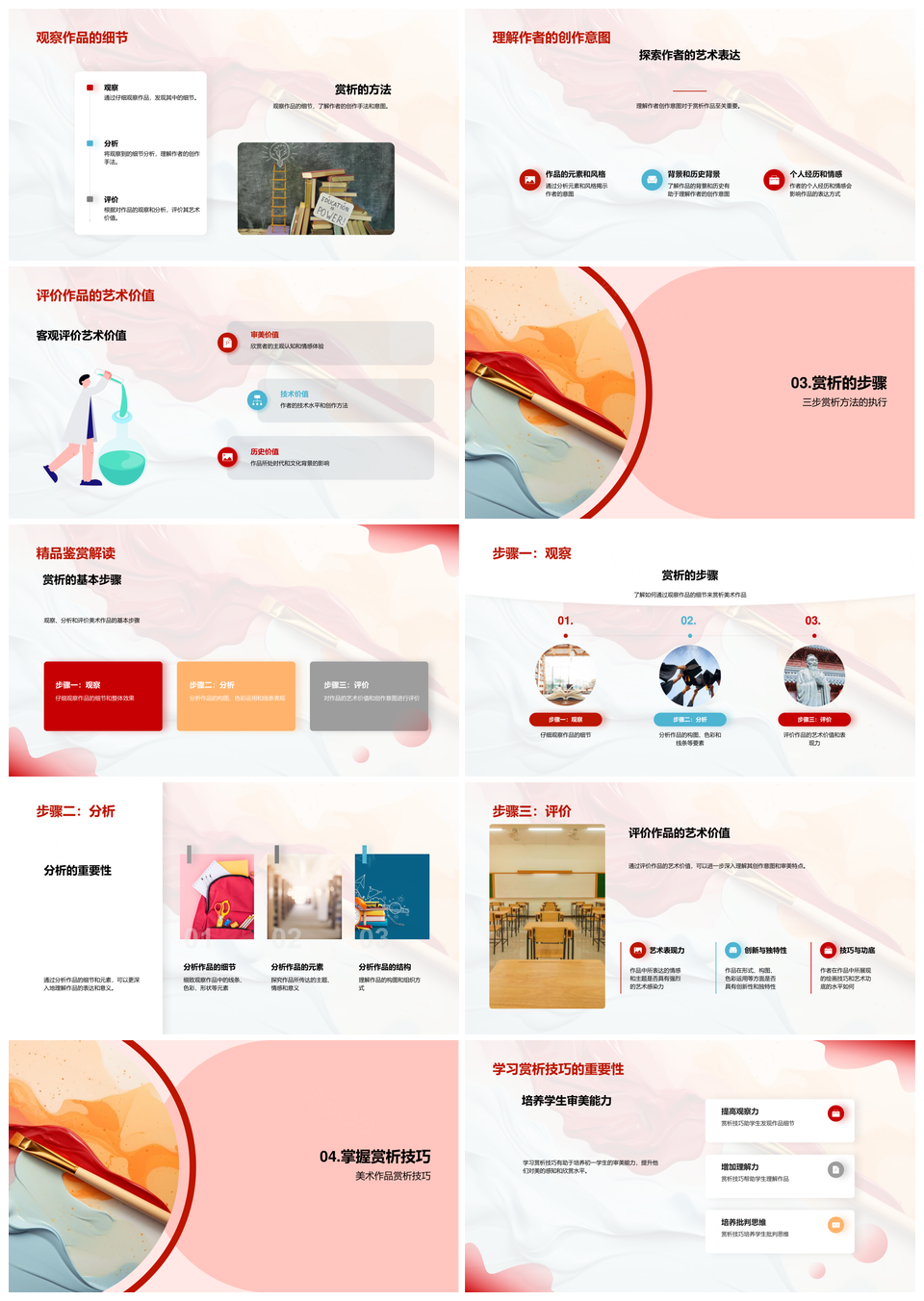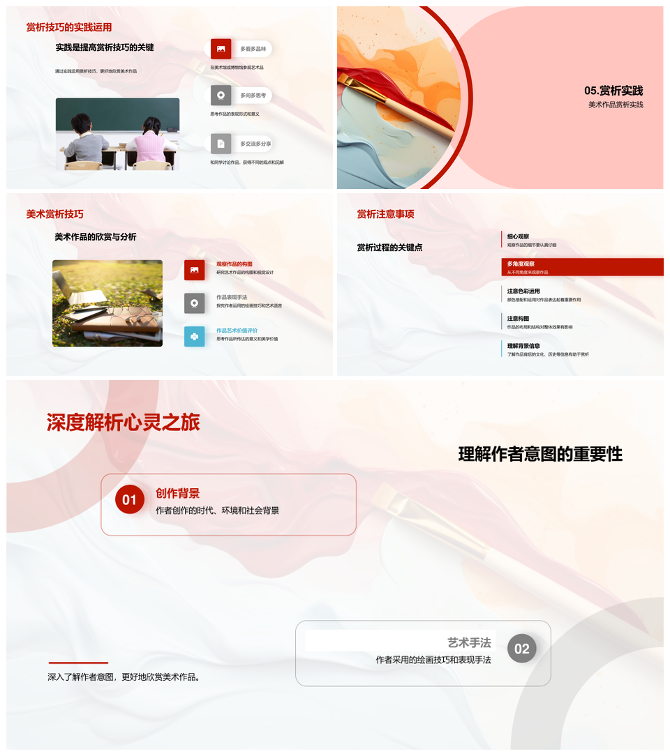 这是一张美术赏析观察分析评价创作意图解析PPT模板,包含美术赏析、观察、分析、评价、创作意图、解析等主题内容,也可用作美术赏析观察分析、赏析观察分析评价、观察分析评价创作意图、分析评价创作意图解析、美术赏析观察、赏析观察分析、观察分析评价、分析评价创作意图、评价创作意图解析、美术赏析、赏析观察、观察分析、分析评价、评价创作意图、创作意图解析等PPT场景使用。