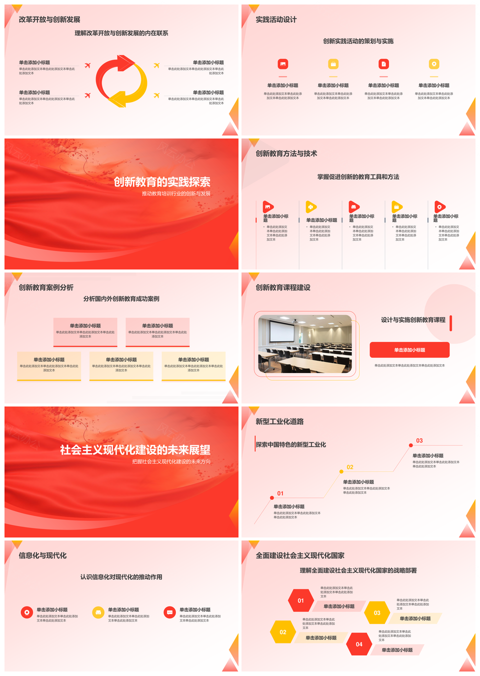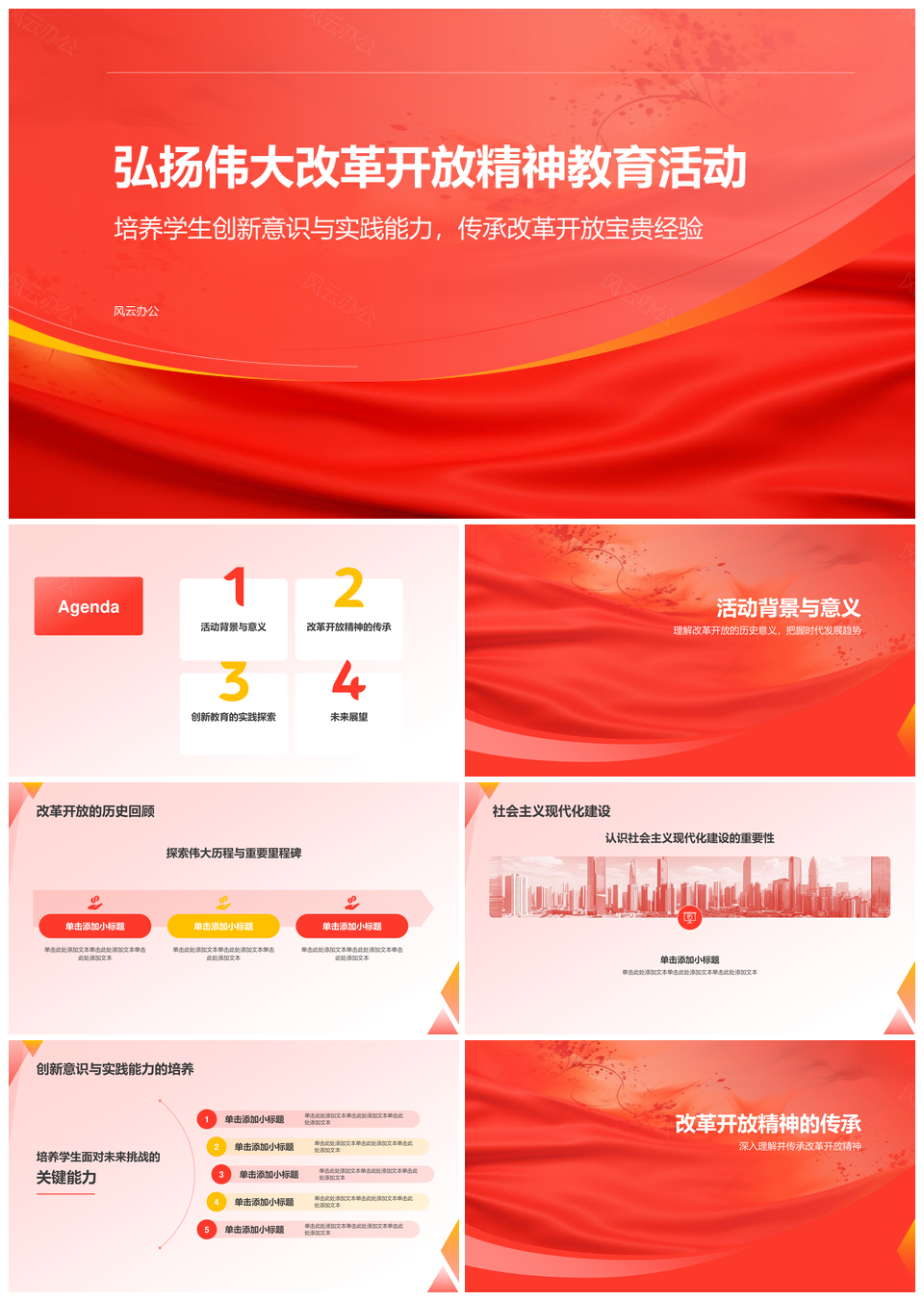 这是一张党政改革开放精神教育实践创新经验建设PPT模板,包含党政、改革开放、精神教育、实践创新、经验建设等主题内容,也可用作党政改革开放精神教育实践、改革开放精神教育实践创新、精神教育实践创新经验、教育实践创新经验建设、党政改革开放精神、改革开放精神教育实践、精神教育实践创新、教育实践创新经验、创新经验建设、党政改革开放、改革开放精神、精神教育实践、教育实践创新、创新经验、经验建设等PPT场景使用。 风云办公提供的党政改革开放精神教育实践创新经验建设PPT模板,下载格式为pptx,一共19页,作品中文字及图均可以修改和编辑,图片更改请在作品中右键图片并更换,文字修改请直接点击文字进行修改。