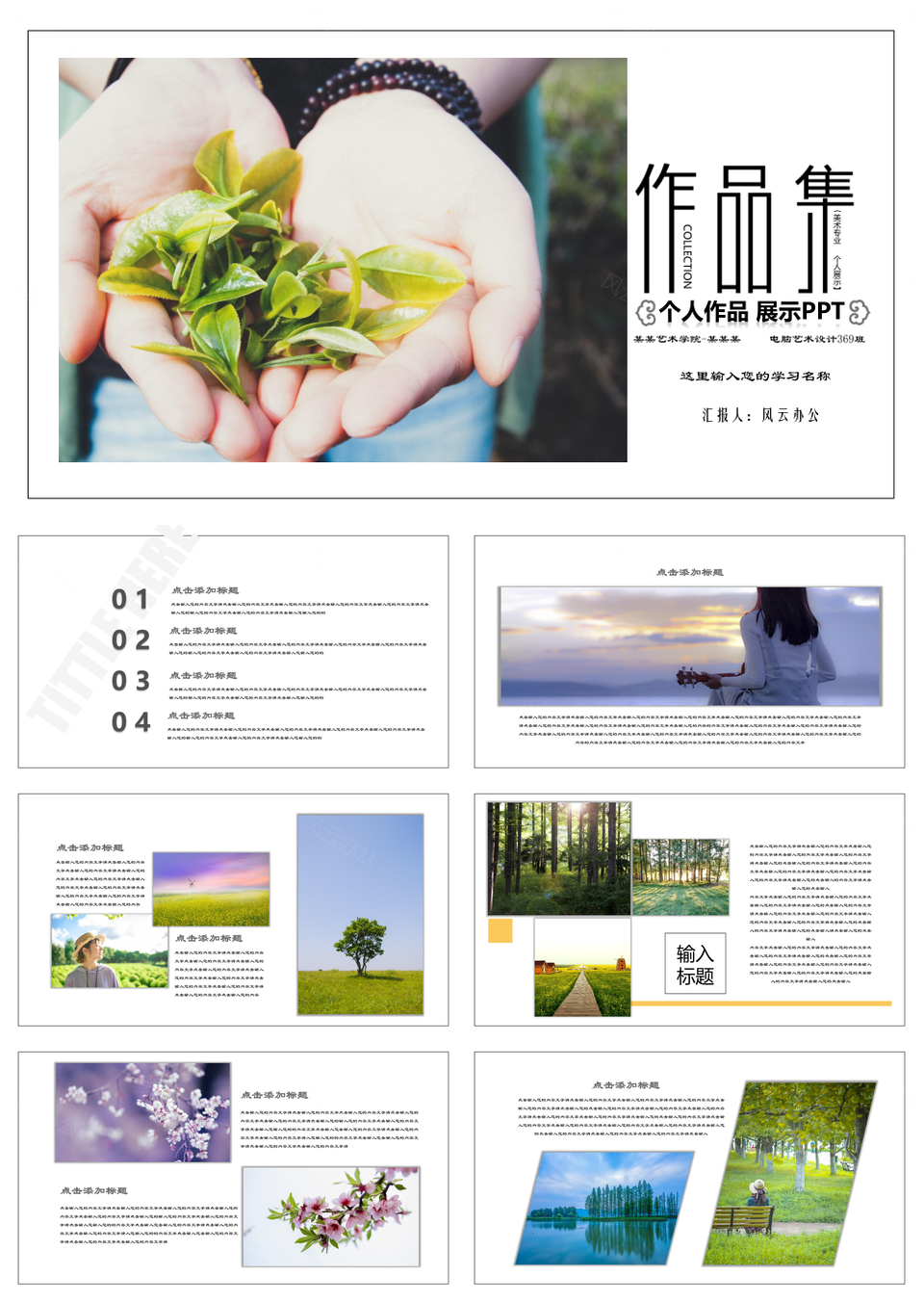 风云办公提供的专业绿色个人作品集影集PPT模板,下载格式为pptx,一共19页,作品中文字及图均可以修改和编辑,图片更改请在作品中右键图片并更换,文字修改请直接点击文字进行修改。