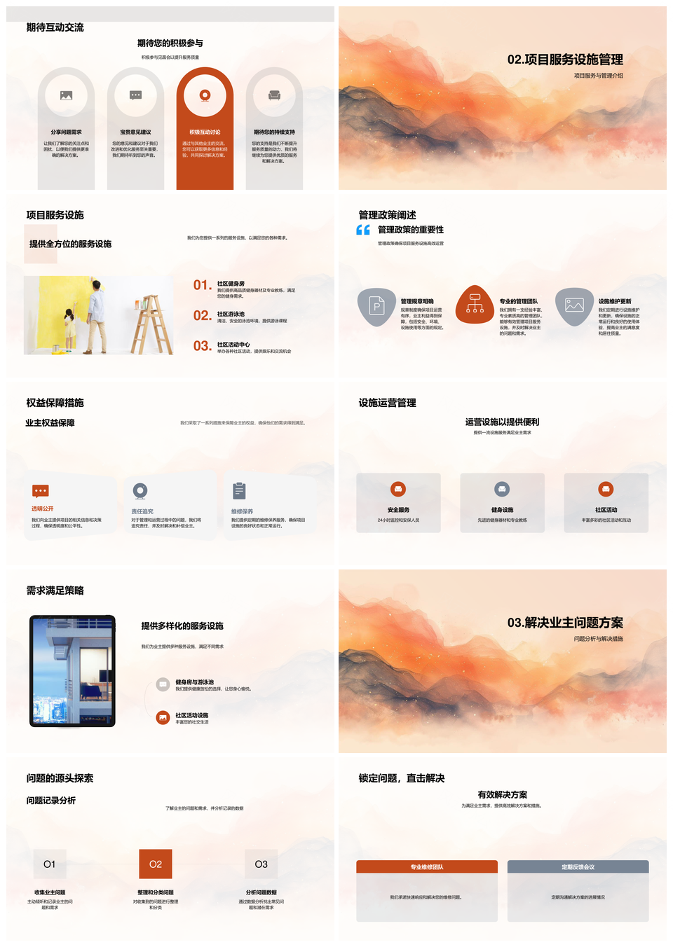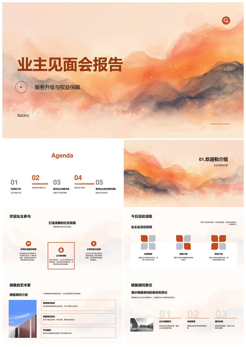 这是一张业主见面会服务升级权益保障管理解决方案报告PPT模板,包含业主、见面会、服务升级、权益保障、管理、解决方案、报告等主题内容,也可用作业主见面会服务升级权益保障管理解决方案报告、业主见面会服务升级权益保障管理解决方案、服务升级权益保障管理解决方案报告、业主见面会服务升级权益保障管理、服务升级权益保障管理解决方案、权益保障管理解决方案报告、业主见面会服务升级权益保障、服务升级权益保障管理、权益保障管理解决方案、管理解决方案报告、业主见面会服务升级、服务升级权益保障、权益保障管理、管理解决方案、解决方案报告等PPT场景使用。 风云办公提供的业主见面会服务升级权益保障管理解决方案报告PPT模板,下载格式为pptx,一共33页,作品中文字及图均可以修改和编辑,图片更改请在作品中右键图片并更换,文字修改请直接点击文字进行修改。