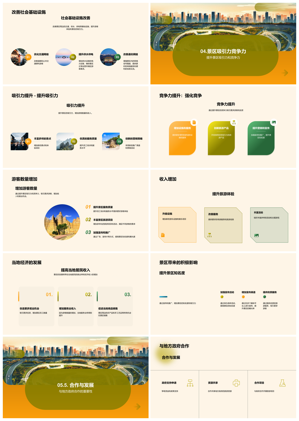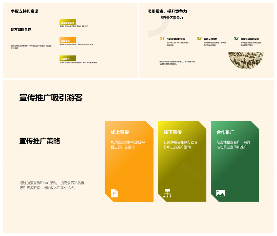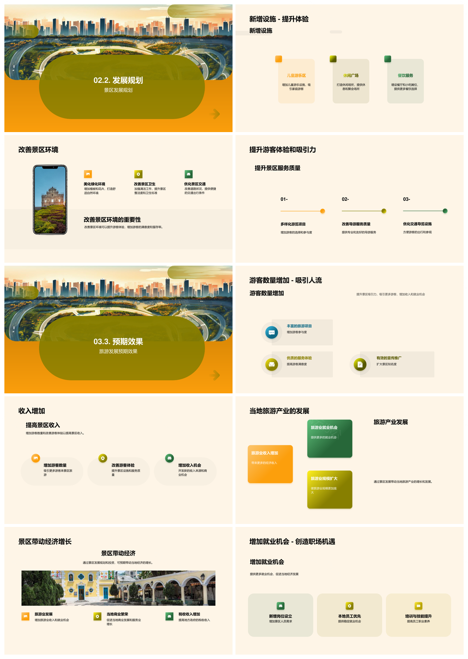 这是一张旅游景区发展规划方案资源整合提升效果PPT模板,包含旅游景区、发展规划、方案、资源整合、提升、效果等主题内容,也可用作旅游景区发展规划、景区发展规划方案、发展规划方案资源、方案资源整合提升、资源整合提升效果、发展资源整合提升、旅游发展规划方案、旅游景区资源整合、发展规划资源整合、旅游景区发展、发展规划方案、资源整合提升、整合提升效果、旅游景区、发展规划、资源整合等PPT场景使用。 风云办公提供的旅游景区发展规划方案资源整合提升效果PPT模板,下载格式为pptx,一共31页,作品中文字及图均可以修改和编辑,图片更改请在作品中右键图片并更换,文字修改请直接点击文字进行修改。