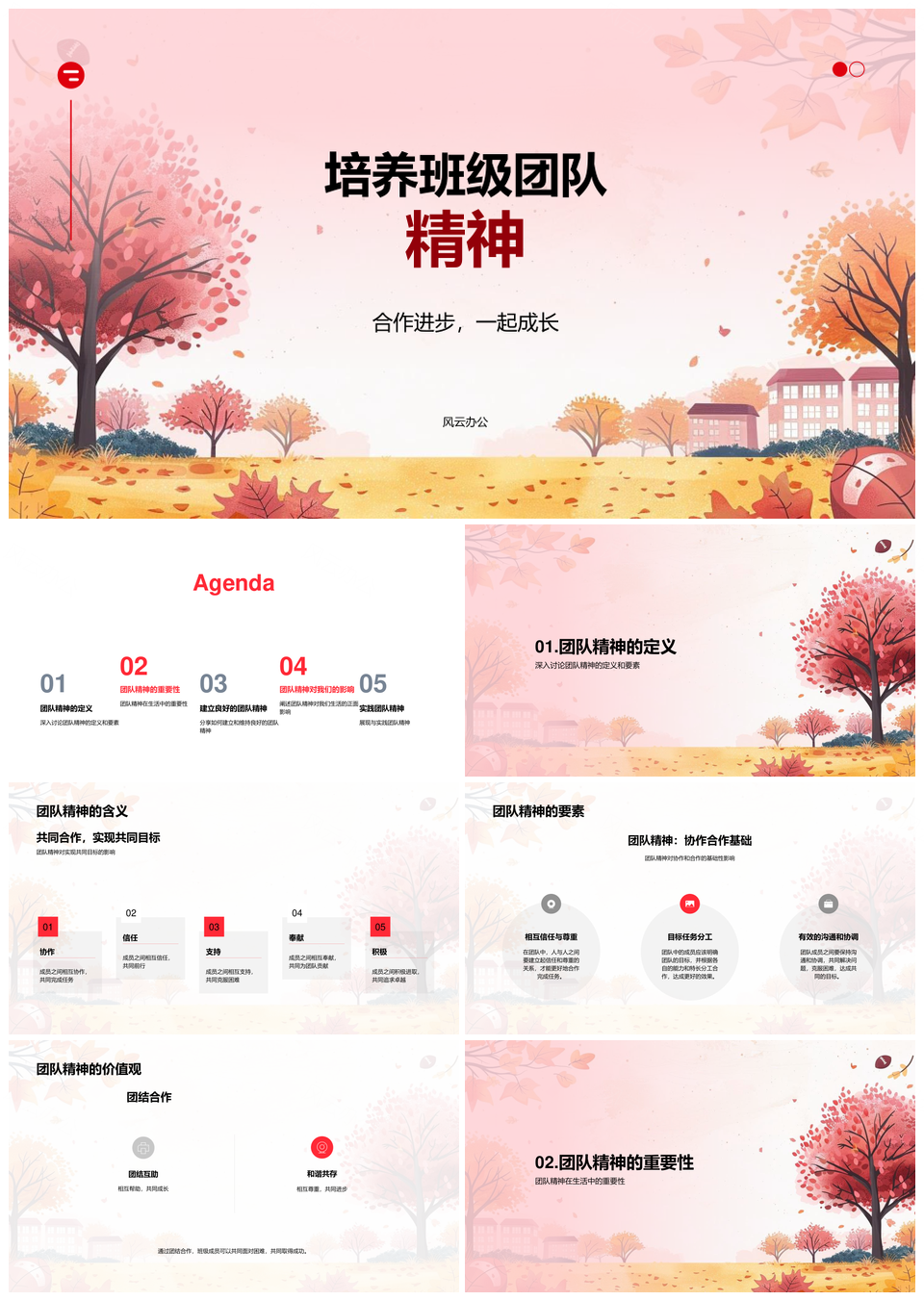 风云办公提供的班级团队协作共建精神成长PPT模板,下载格式为pptx,一共23页,作品中文字及图均可以修改和编辑,图片更改请在作品中右键图片并更换,文字修改请直接点击文字进行修改。