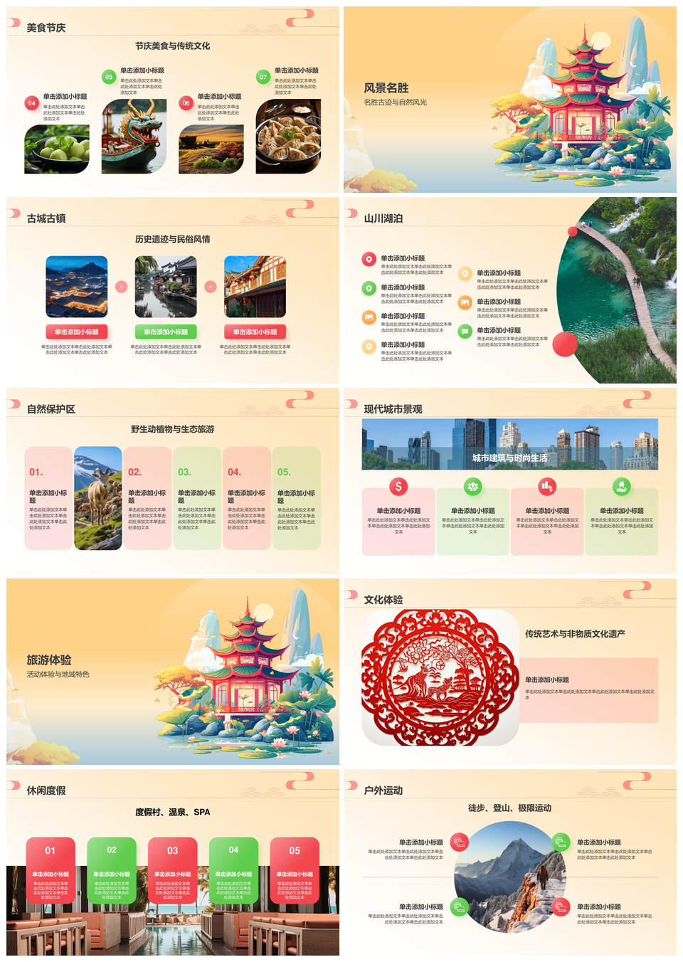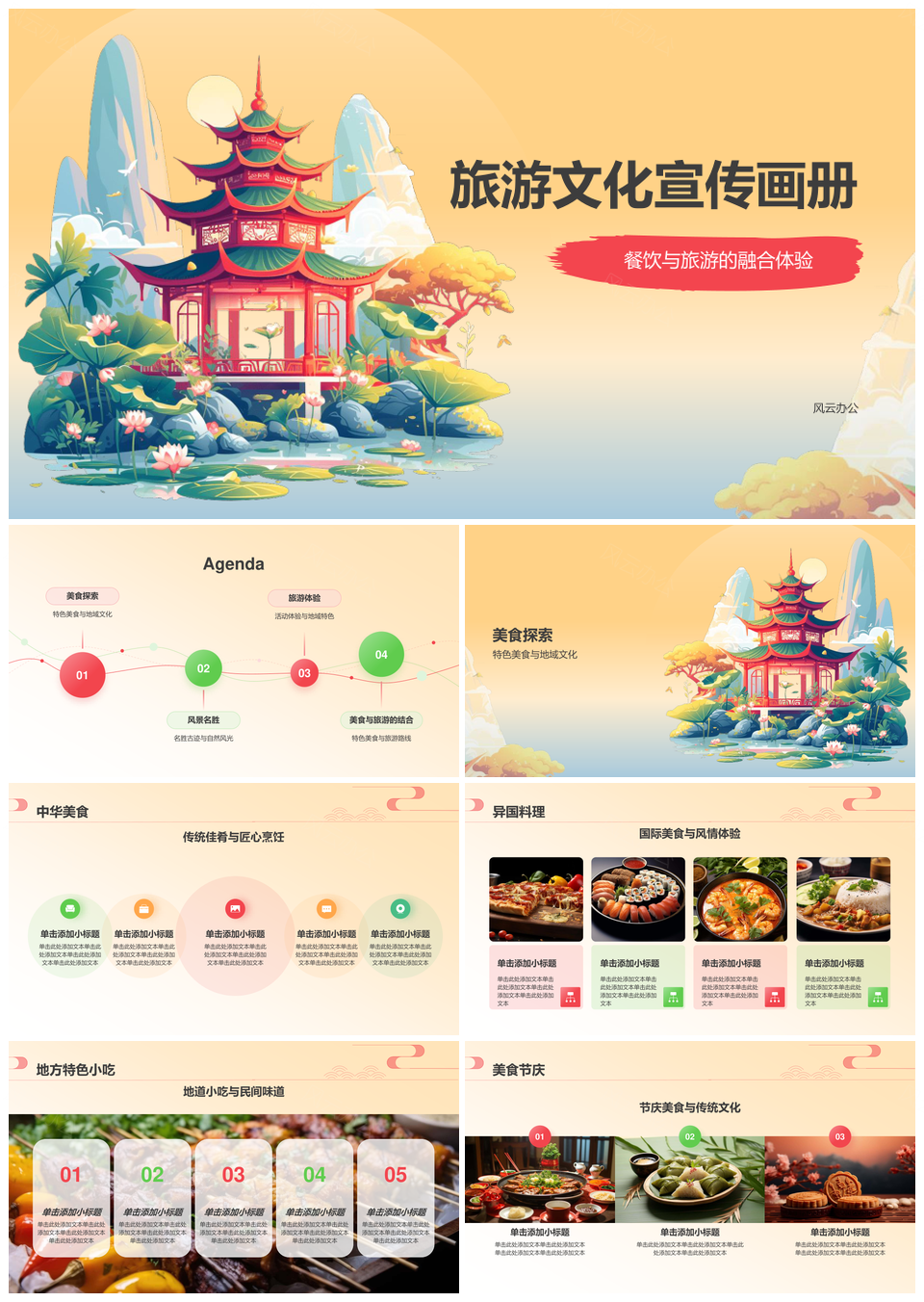 风云办公提供的红色国潮旅游文化景区宣传画册PPT模板,下载格式为pptx,一共22页,作品中文字及图均可以修改和编辑,图片更改请在作品中右键图片并更换,文字修改请直接点击文字进行修改。