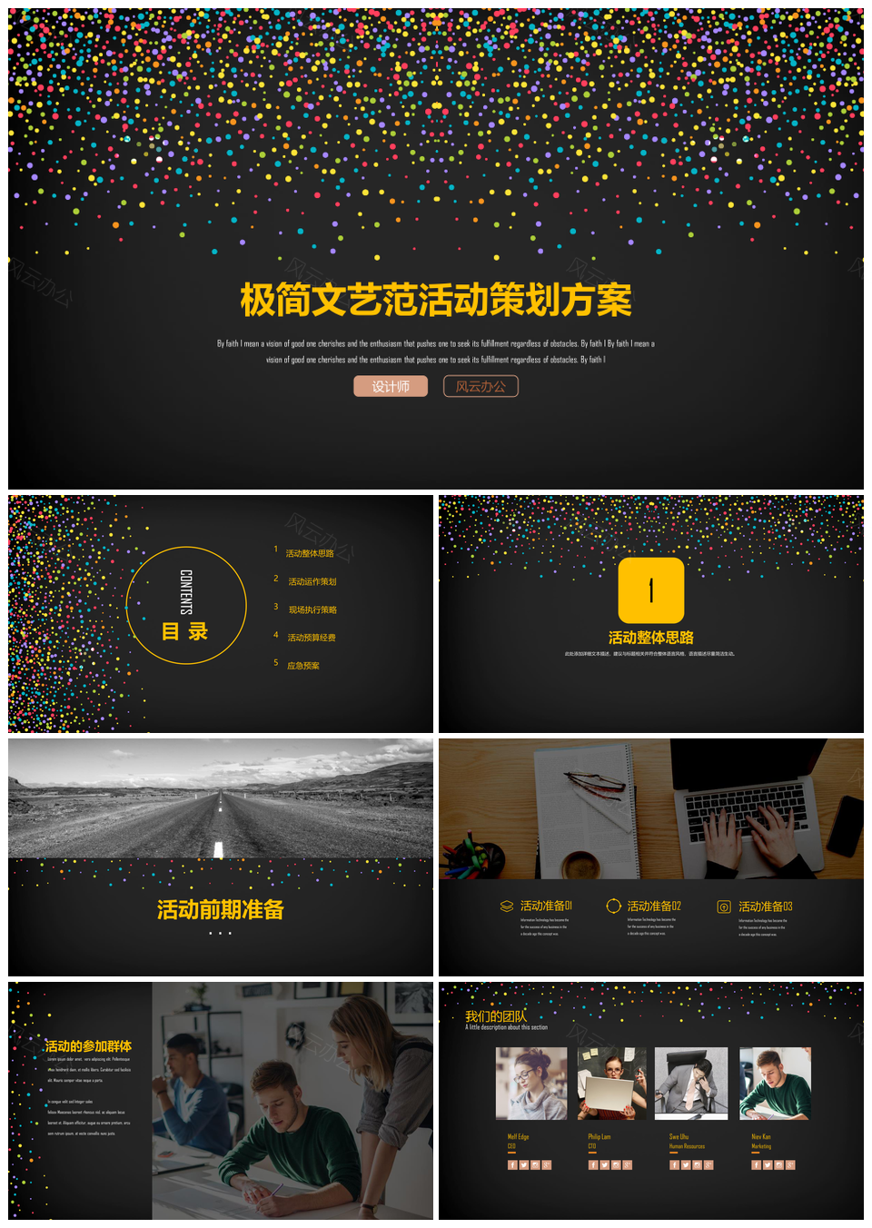 风云办公提供的黑色极简文艺范活动策划通用PPT模板,下载格式为pptx,一共22页,作品中文字及图均可以修改和编辑,图片更改请在作品中右键图片并更换,文字修改请直接点击文字进行修改。