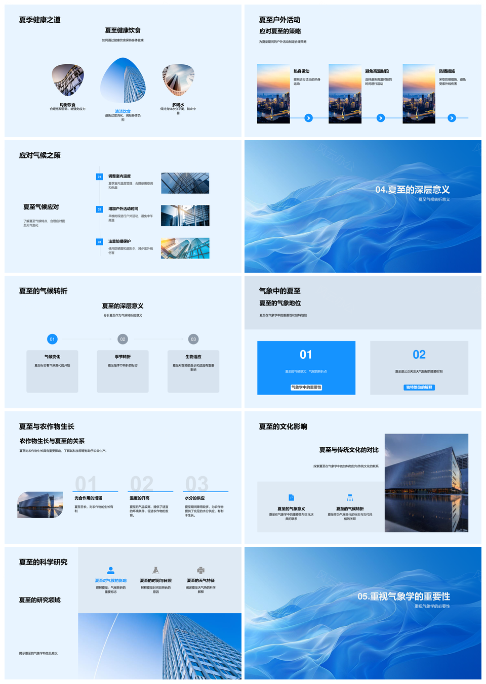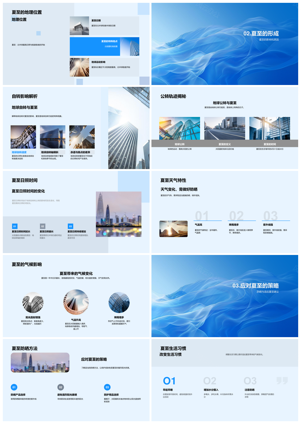 这是一张夏至气象学日照地球自转公转防晒生活指南PPT模板,包含夏至、气象学、日照、地球、自转、公转、防晒、生活指南等主题内容,也可用作夏至气象学日照地球、夏至日照地球自转、夏至地球自转公转、气象学日照地球自转、日照地球自转公转、地球自转公转防晒、自转公转防晒生活、公转防晒生活指南、夏至气象学生活指南、夏至日照防晒生活、气象学地球自转公转、夏至防晒生活指南、地球自转公转、自转公转防晒、生活指南等PPT场景使用。 风云办公提供的夏至气象学日照地球自转公转防晒生活指南PPT模板,下载格式为pptx,一共33页,作品中文字及图均可以修改和编辑,图片更改请在作品中右键图片并更换,文字修改请直接点击文字进行修改。