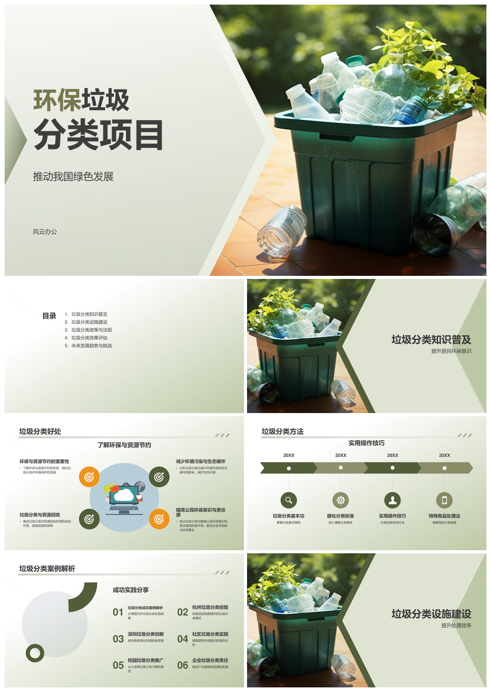 这是一张厨房垃圾分类塑胶玻璃瓶循环利用回收桶可持续PPT模板,包含厨房垃圾、垃圾分类、塑胶瓶、玻璃瓶、循环利用、回收桶、可持续等主题内容,也可用作厨房垃圾循环利用回收桶可持续、塑胶玻璃瓶循环利用回收桶、垃圾分类塑胶玻璃瓶回收、可持续循环利用回收桶、厨房垃圾分类塑胶玻璃瓶、循环利用回收桶可持续、塑胶玻璃瓶回收桶可持续、垃圾分类循环利用回收、厨房垃圾回收桶可持续、分类塑胶玻璃瓶循环利用、回收桶可持续循环利用、塑胶玻璃瓶循环利用、厨房垃圾分类回收桶、循环利用回收桶、垃圾分类回收桶等PPT场景使用。 风云办公提供的厨房垃圾分类塑胶玻璃瓶循环利用回收桶可持续PPT模板,下载格式为pptx,一共22页,作品中文字及图均可以修改和编辑,图片更改请在作品中右键图片并更换,文字修改请直接点击文字进行修改。