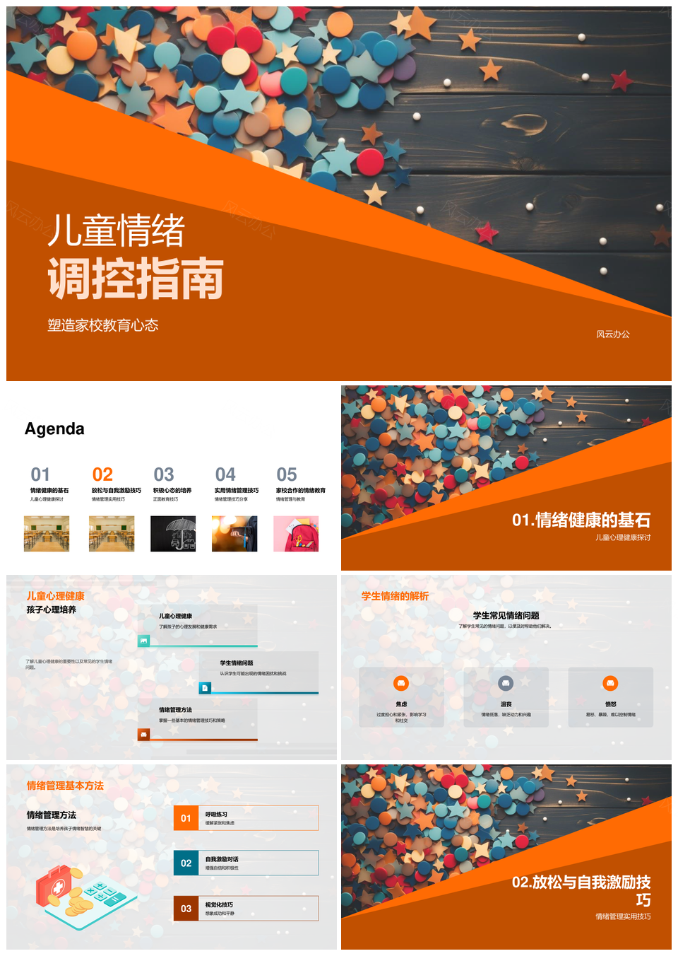 风云办公提供的家校共育儿童情绪调控心理技巧PPT模板,下载格式为pptx,一共24页,作品中文字及图均可以修改和编辑,图片更改请在作品中右键图片并更换,文字修改请直接点击文字进行修改。