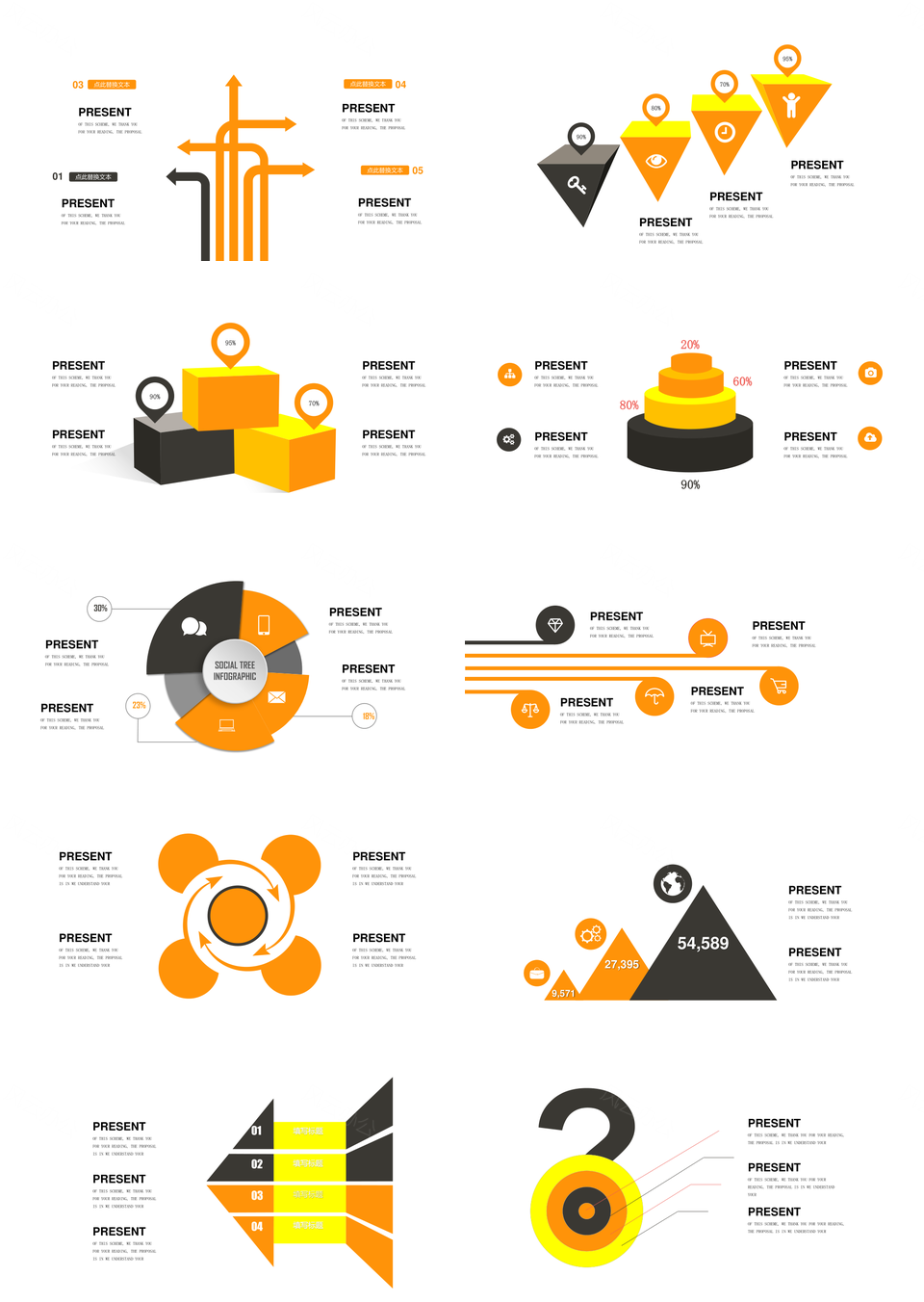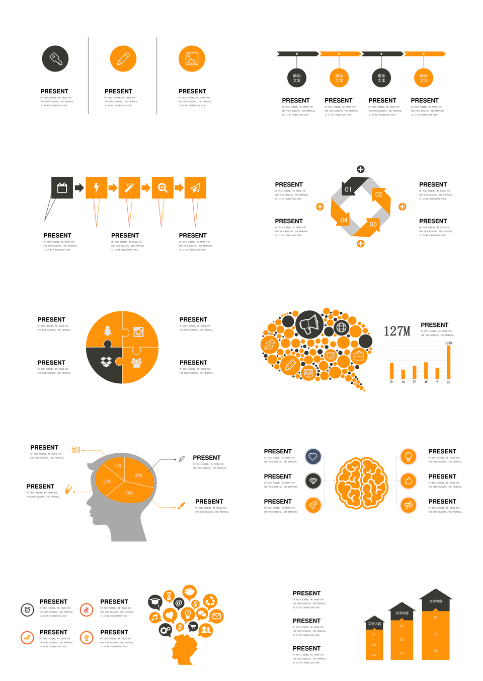 这是一张橘黄色商务通用并列关系循环关系PPT图表合集,包含橘黄色、商务、并列关系、循环关系、图表合集等主题内容,也可用作橘黄色、商务、通用、并列关系、循环关系、PPT、图表、合集