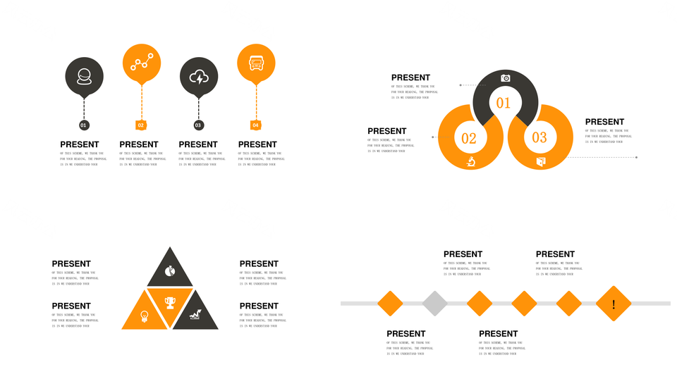 风云办公提供的橘黄色商务通用并列关系循环关系PPT图表合集,下载格式为pptx,一共31页,作品中文字及图均可以修改和编辑,图片更改请在作品中右键图片并更换,文字修改请直接点击文字进行修改。