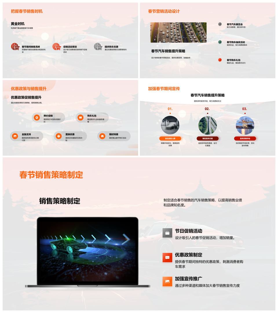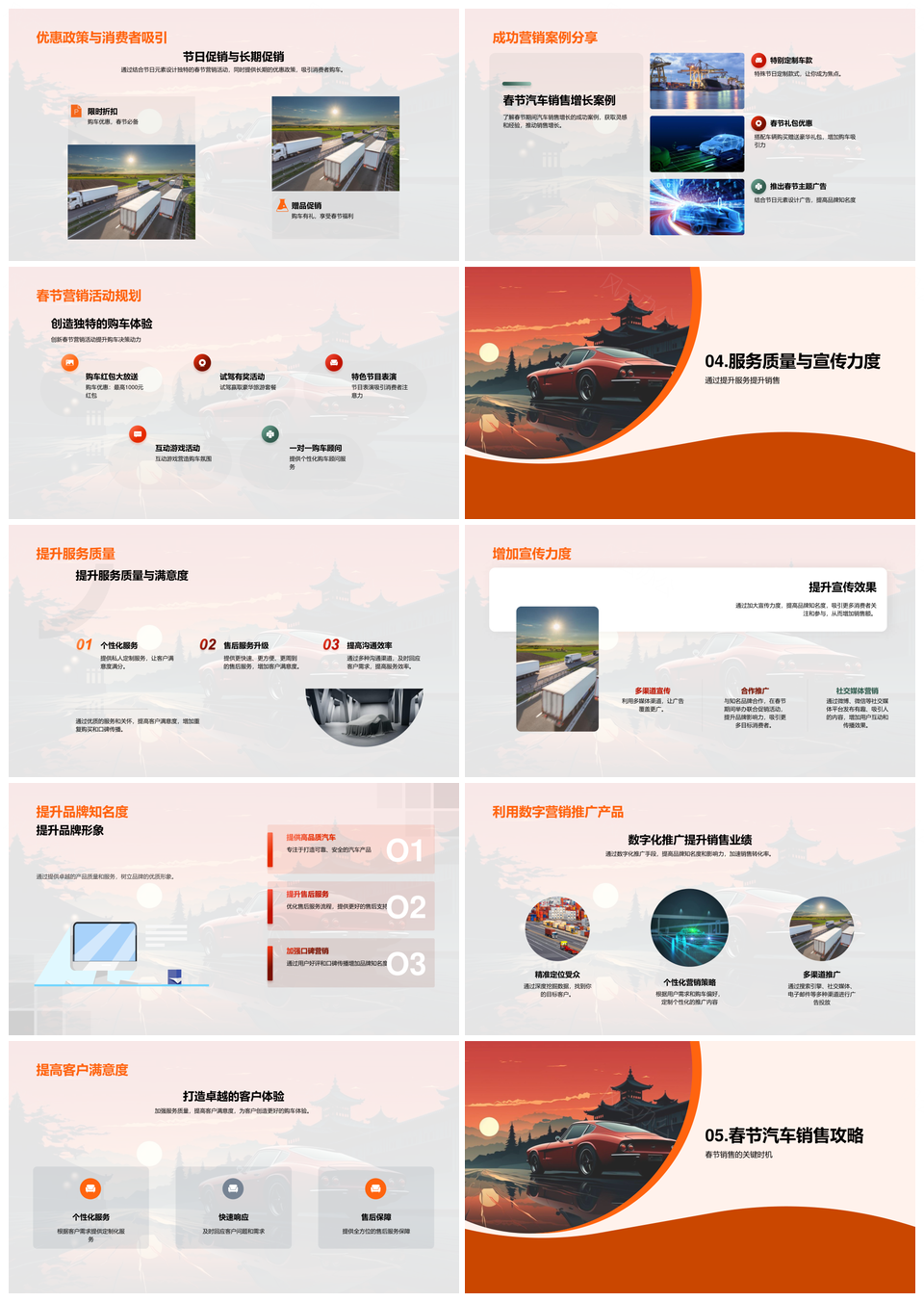 这是一张春节汽车销售策略创新优惠红灯笼提升销量PPT模板,包含春节、汽车销售策略、创新、优惠、红灯笼、销量等主题内容,也可用作春节汽车销售策略、汽车销售策略创新、销售策略创新优惠、春节优惠提升销量、创新优惠提升销量、优惠红灯笼提升销量、春节汽车创新优惠、汽车销售创新、销售策略创新、策略创新优惠、春节优惠红灯笼、红灯笼提升销量、春节汽车优惠、提升销量、创新优惠等PPT场景使用。 风云办公提供的春节汽车销售策略创新优惠红灯笼提升销量PPT模板,下载格式为pptx,一共33页,作品中文字及图均可以修改和编辑,图片更改请在作品中右键图片并更换,文字修改请直接点击文字进行修改。