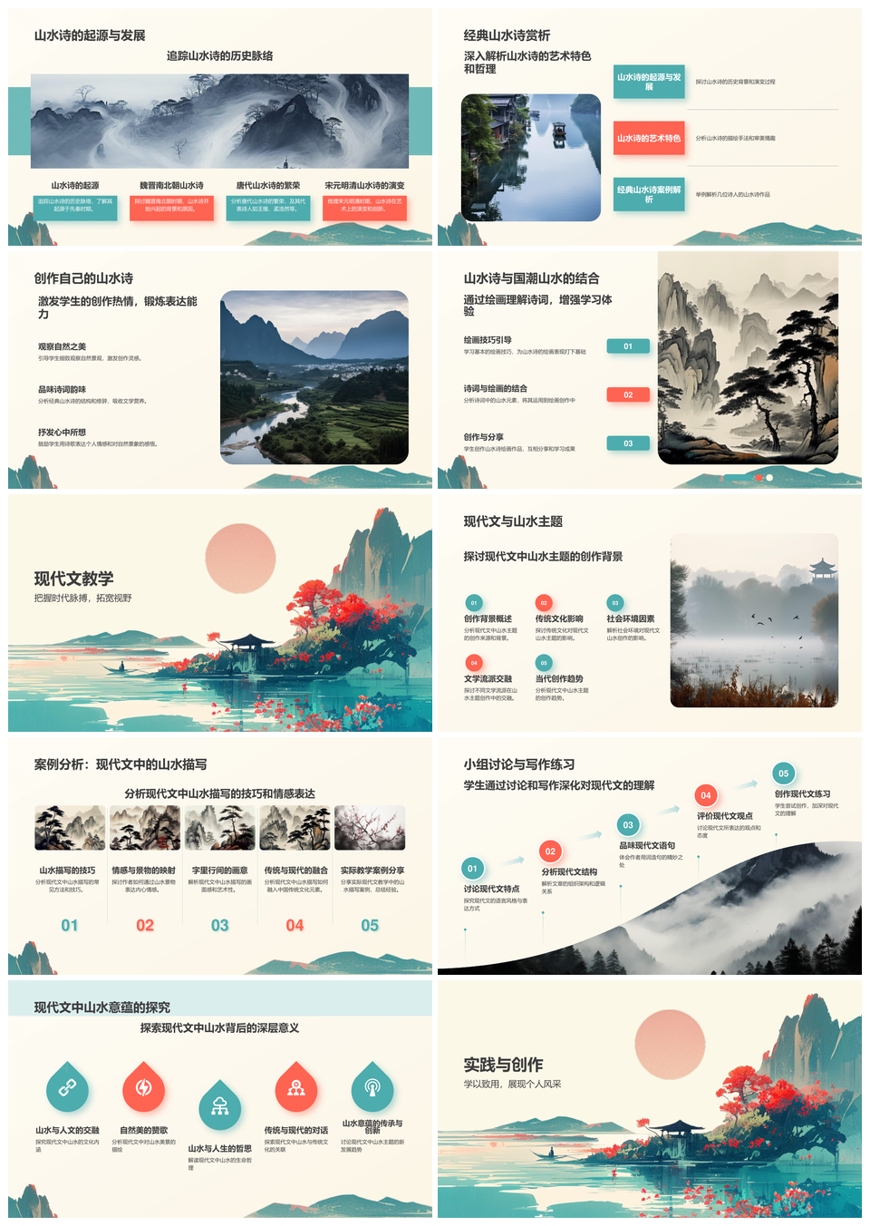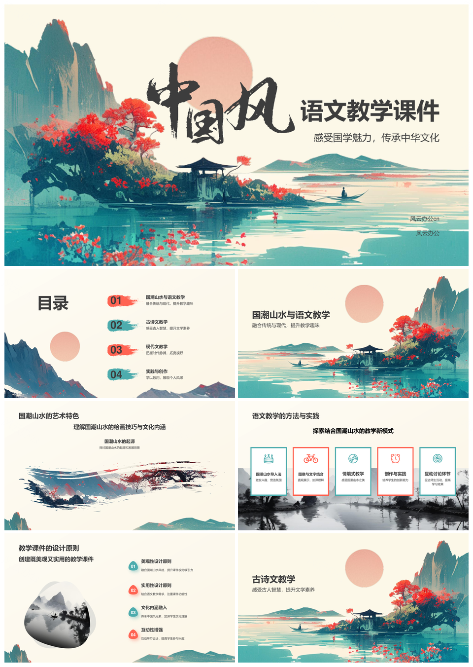 风云办公提供的国潮山水语文教学创意文化传承课件,下载格式为pptx,一共22页,作品中文字及图均可以修改和编辑,图片更改请在作品中右键图片并更换,文字修改请直接点击文字进行修改。