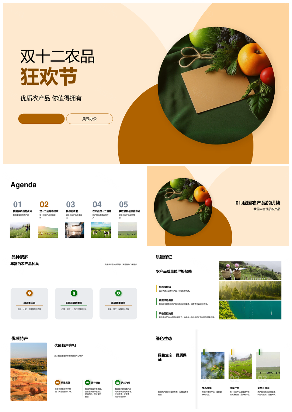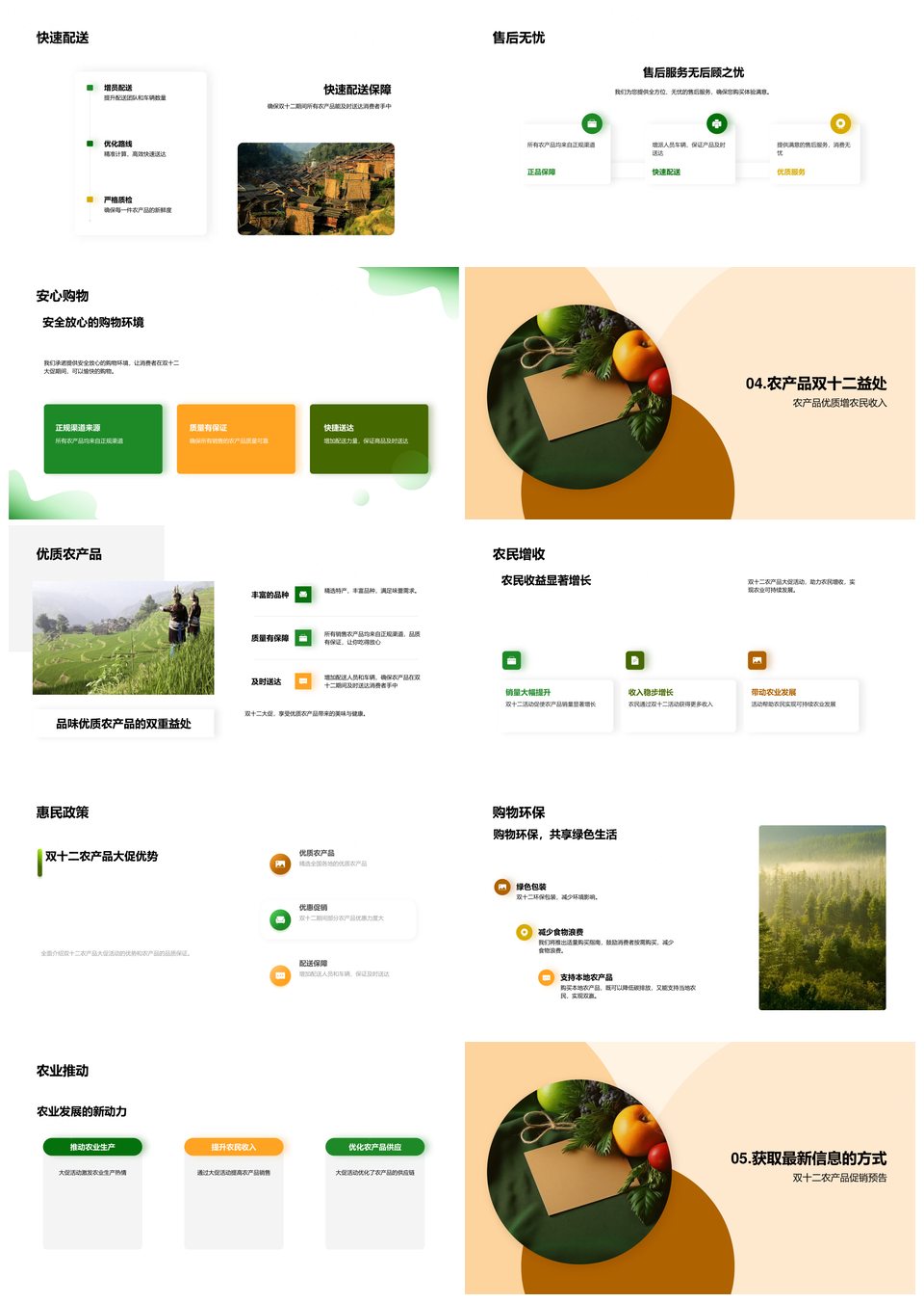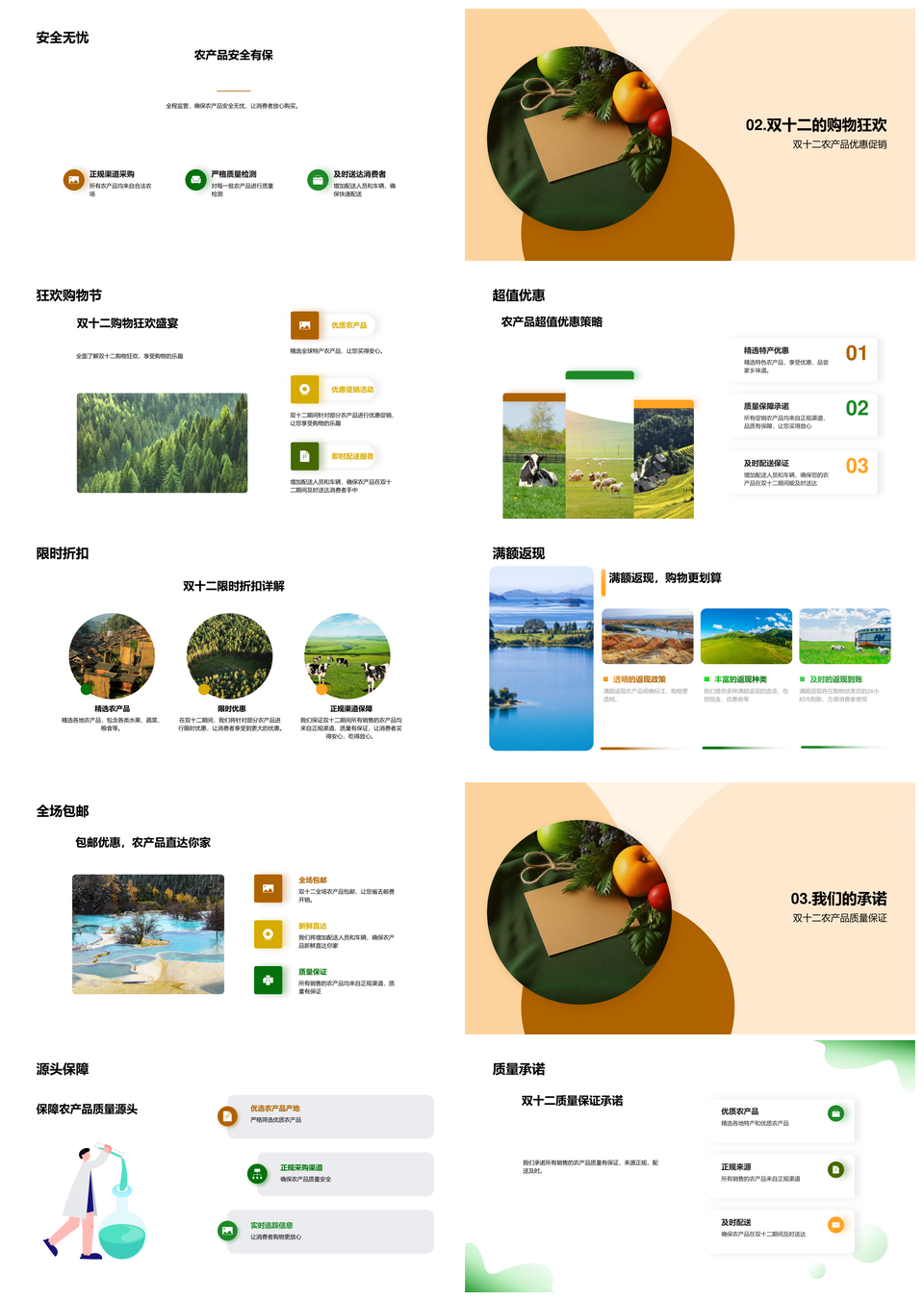 这是一张双十二农品狂欢节官网大促优质农品助农增收新鲜果蔬PPT模板,包含双十二、农品、狂欢节、官网、大促、优质、农品、助农、增收、新鲜、果蔬等主题内容,也可用作官网大促优质农品、优质农品助农增收、助农增收新鲜果蔬、双十二农品狂欢节、狂欢节官网大促、大促优质农品、农品助农增收、助农增收新鲜、增收新鲜果蔬、双十二农品、农品狂欢节、狂欢节官网、官网大促、优质农品、助农增收等PPT场景使用。 风云办公提供的双十二农品狂欢节官网大促优质农品助农增收新鲜果蔬PPT模板,下载格式为pptx,一共33页,作品中文字及图均可以修改和编辑,图片更改请在作品中右键图片并更换,文字修改请直接点击文字进行修改。