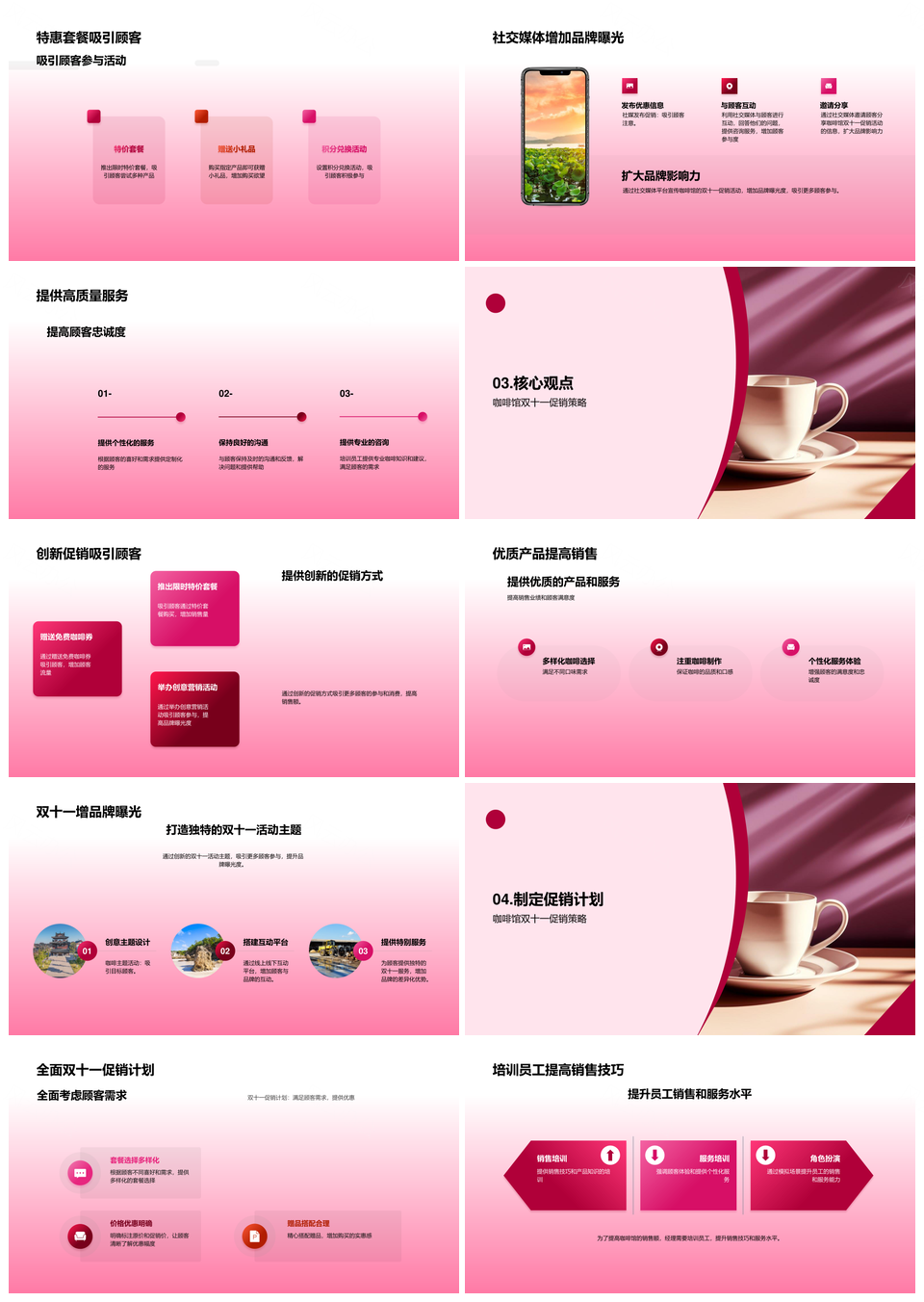 这是一张咖啡馆双十一促销活动优化品牌产品定位PPT模板,包含咖啡馆、双十一、促销活动、优化、品牌、产品、定位等主题内容,也可用作咖啡馆双十一促销活动优化品牌、双十一促销活动优化产品定位、咖啡馆双十一促销活动优化、促销活动优化品牌产品定位、咖啡馆双十一促销活动、双十一促销活动优化、促销活动优化品牌、促销活动优化产品定位、优化品牌产品定位、咖啡馆促销活动优化、双十一促销活动、促销活动优化、优化品牌、优化产品定位、品牌产品定位等PPT场景使用。 风云办公提供的咖啡馆双十一促销活动优化品牌产品定位PPT模板,下载格式为pptx,一共19页,作品中文字及图均可以修改和编辑,图片更改请在作品中右键图片并更换,文字修改请直接点击文字进行修改。