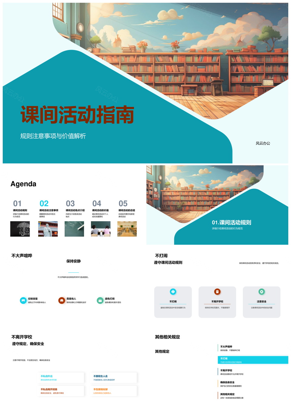 风云办公提供的校园课间活动安全环保规则注意事项PPT模板,下载格式为pptx,一共24页,作品中文字及图均可以修改和编辑,图片更改请在作品中右键图片并更换,文字修改请直接点击文字进行修改。