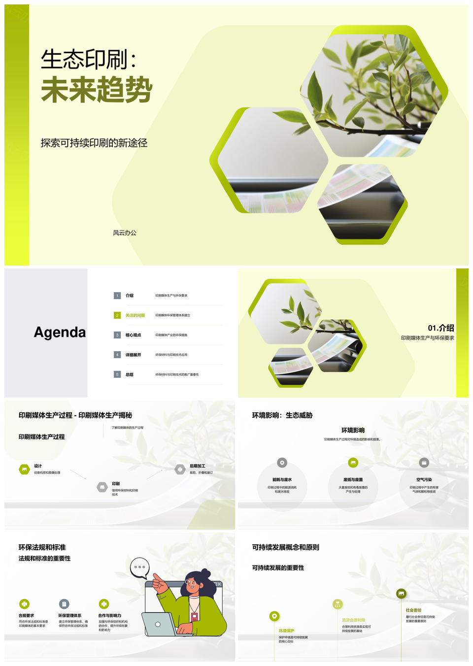 风云办公提供的生态印刷媒体环保生产可持续发展PPT模板,下载格式为pptx,一共29页,作品中文字及图均可以修改和编辑,图片更改请在作品中右键图片并更换,文字修改请直接点击文字进行修改。
