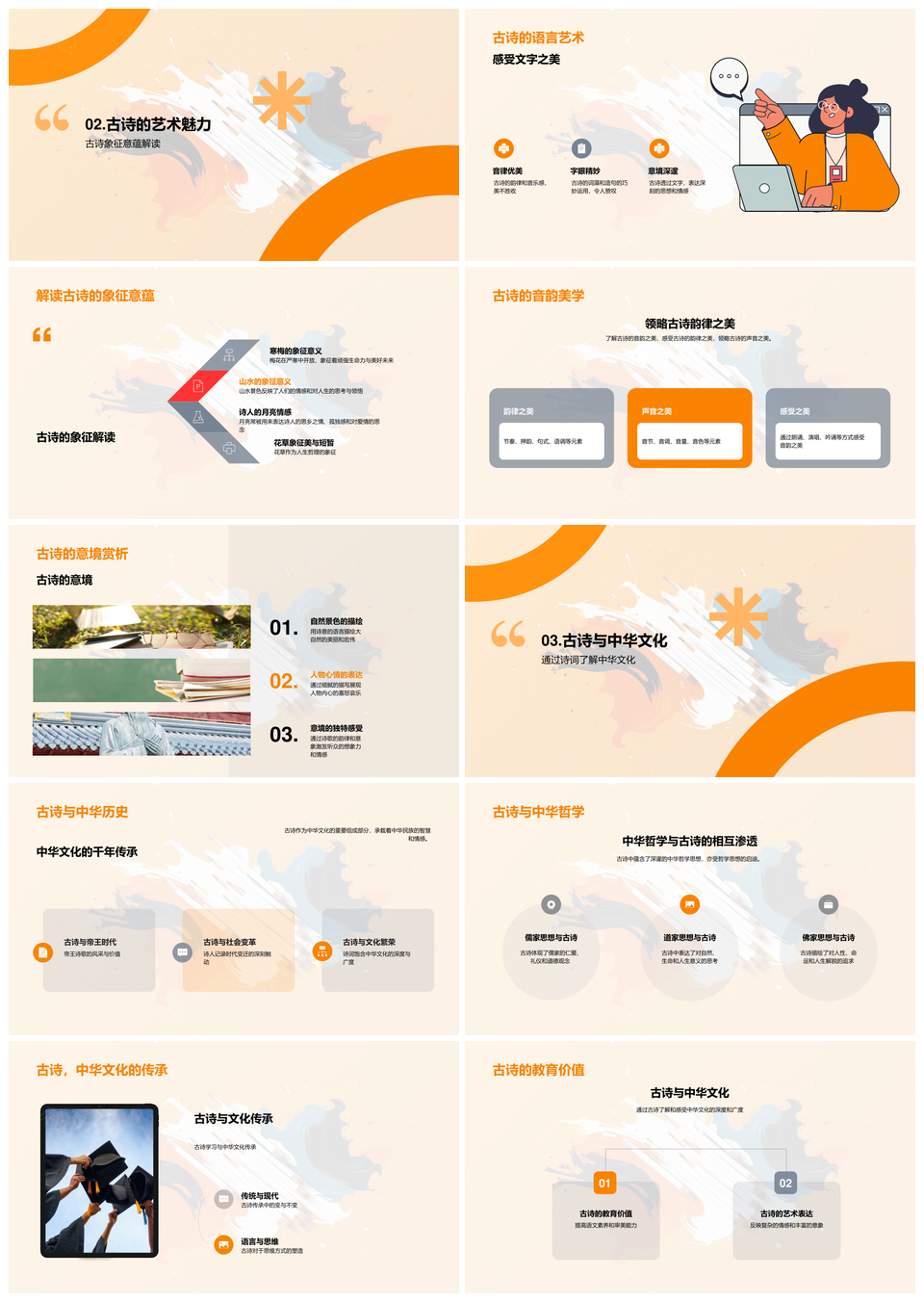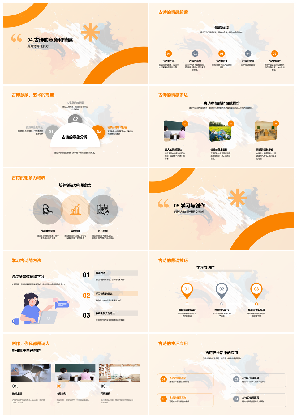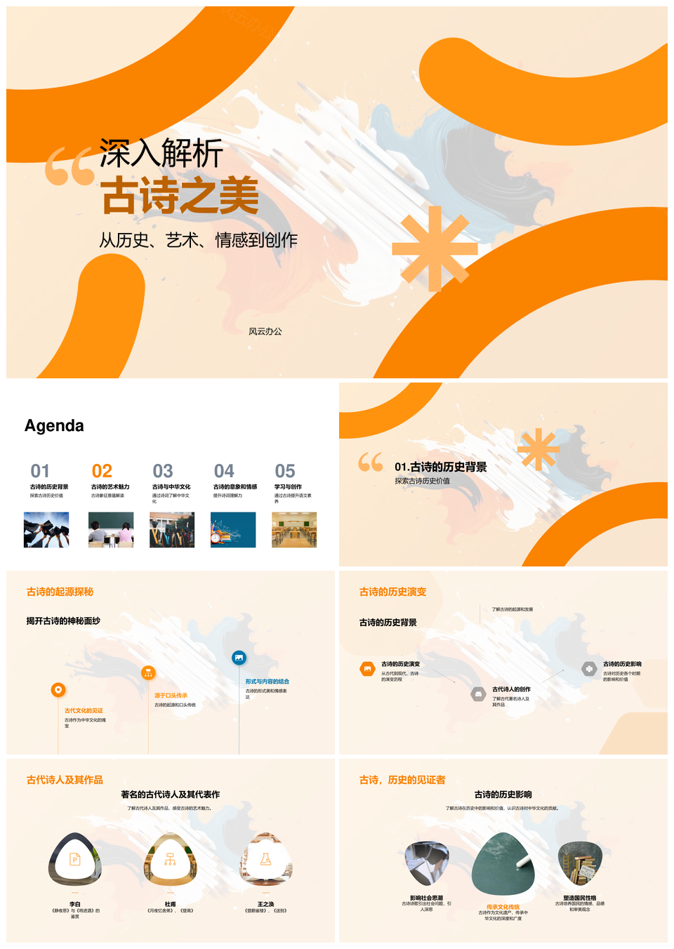 风云办公提供的古诗艺术意象历史情感创作解析PPT模板,下载格式为pptx,一共28页,作品中文字及图均可以修改和编辑,图片更改请在作品中右键图片并更换,文字修改请直接点击文字进行修改。