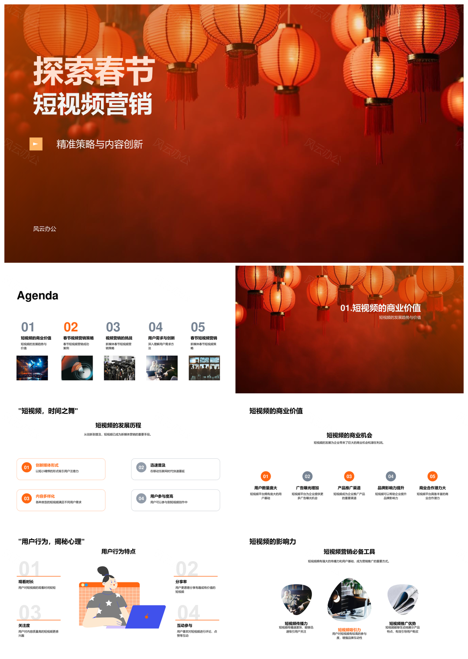 风云办公提供的春节短视频营销新媒体创新与精准策略PPT模板,下载格式为pptx,一共28页,作品中文字及图均可以修改和编辑,图片更改请在作品中右键图片并更换,文字修改请直接点击文字进行修改。