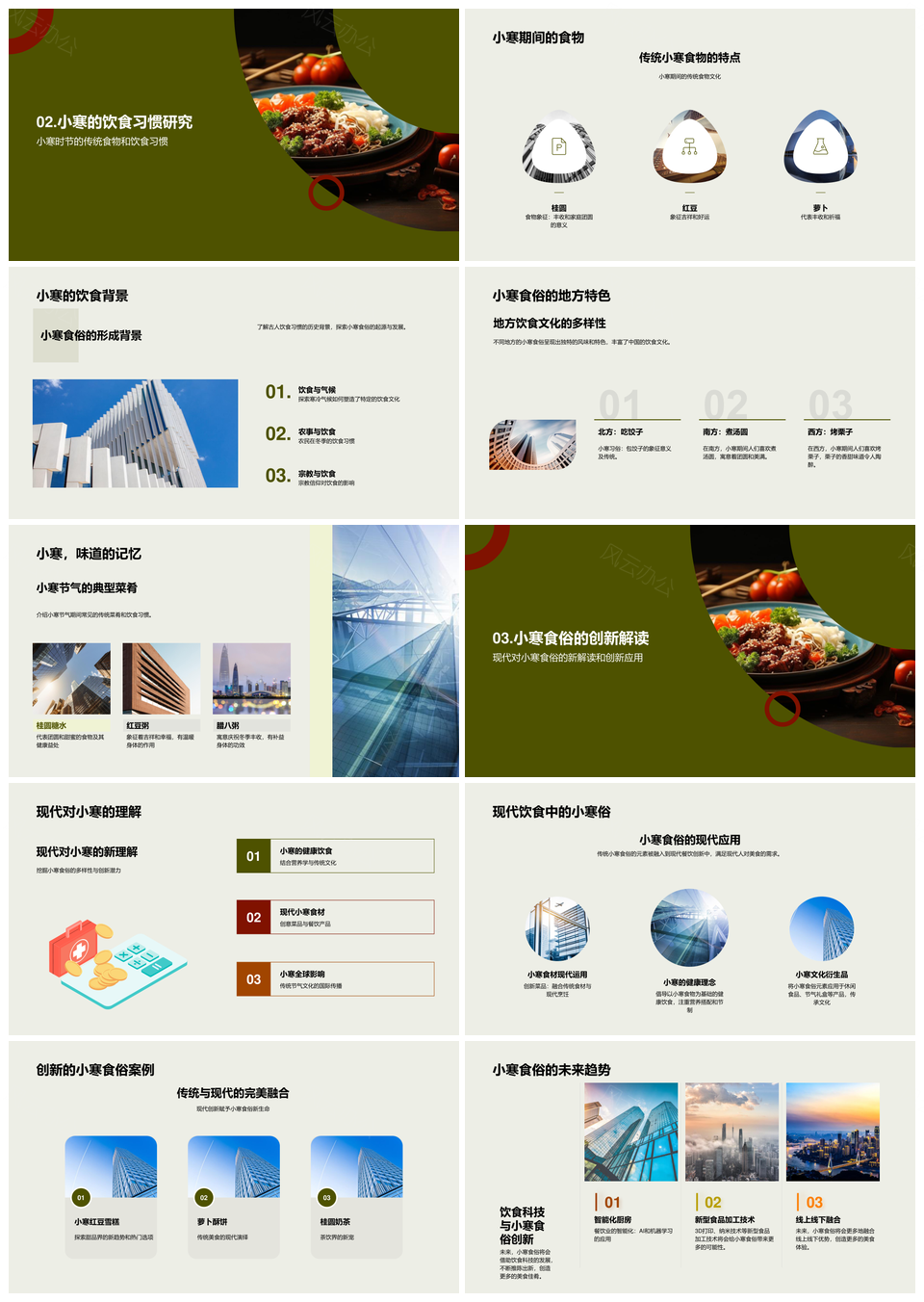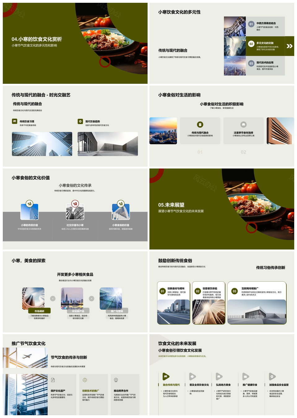 风云办公提供的小寒饮食文化传统现代创新演变PPT模板,下载格式为pptx,一共28页,作品中文字及图均可以修改和编辑,图片更改请在作品中右键图片并更换,文字修改请直接点击文字进行修改。