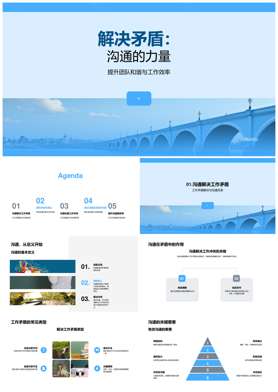 风云办公提供的沟通化解工作矛盾提升团队效率和谐PPT模板,下载格式为pptx,一共33页,作品中文字及图均可以修改和编辑,图片更改请在作品中右键图片并更换,文字修改请直接点击文字进行修改。