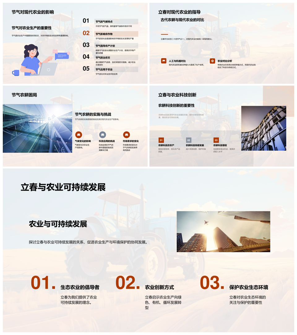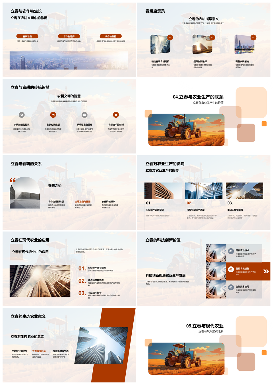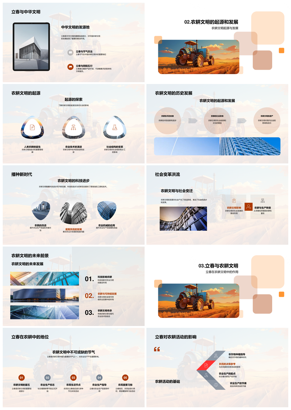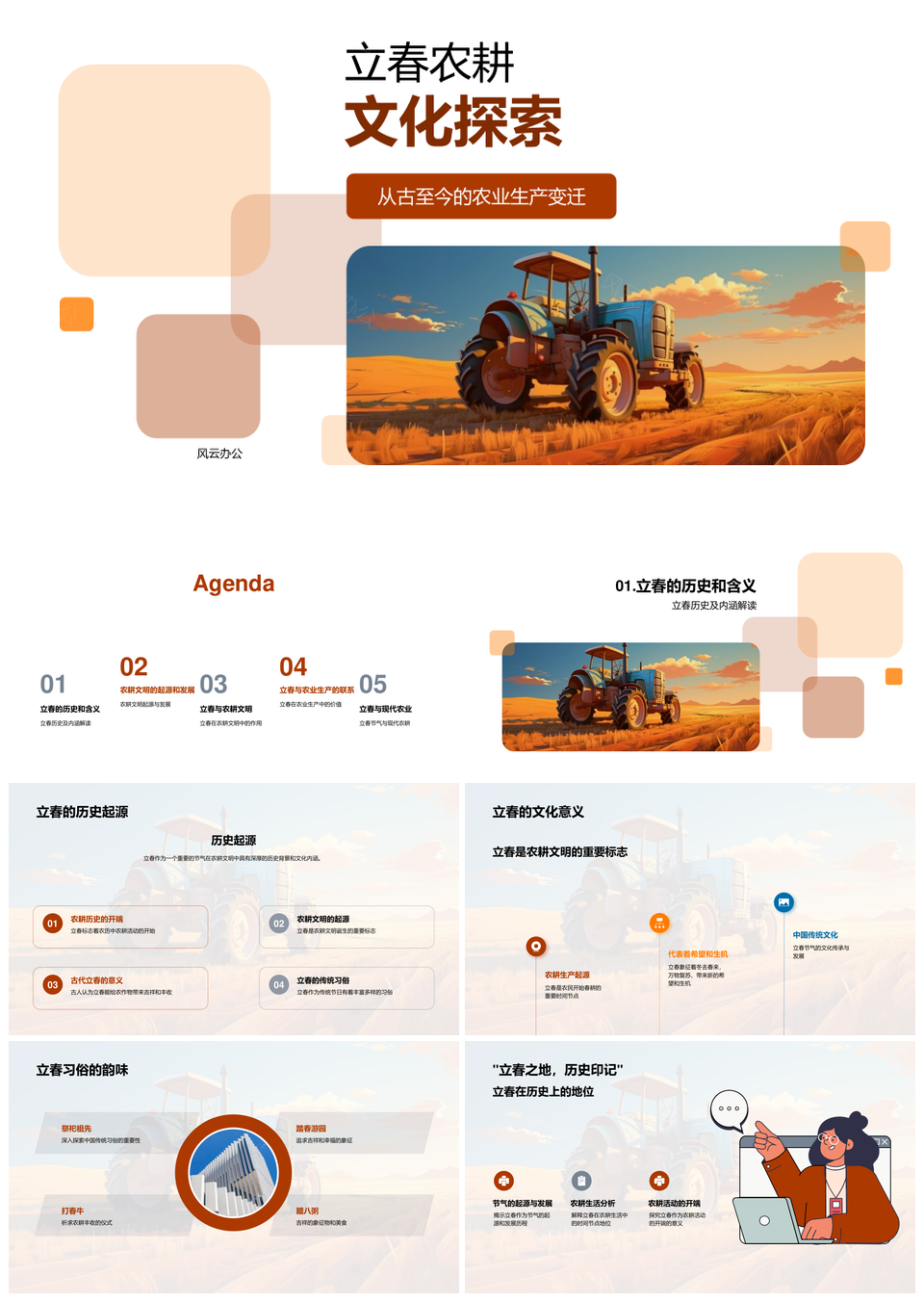 风云办公提供的立春农耕文明与古今农业变迁探析PPT模板,下载格式为pptx,一共33页,作品中文字及图均可以修改和编辑,图片更改请在作品中右键图片并更换,文字修改请直接点击文字进行修改。