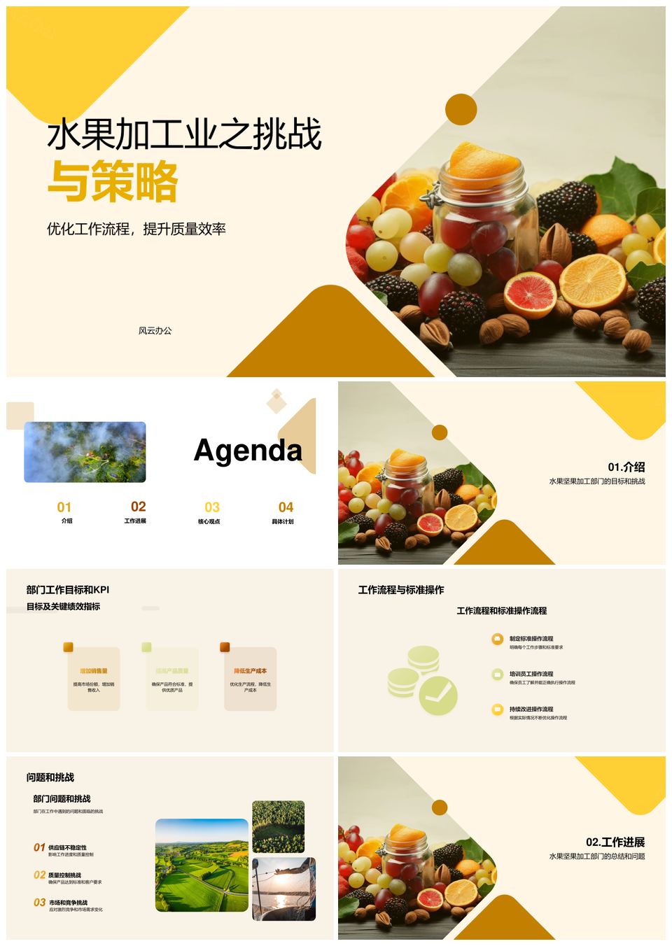 风云办公提供的水果坚果加工部门工作进展总结汇报PPT模板,下载格式为pptx,一共19页,作品中文字及图均可以修改和编辑,图片更改请在作品中右键图片并更换,文字修改请直接点击文字进行修改。
