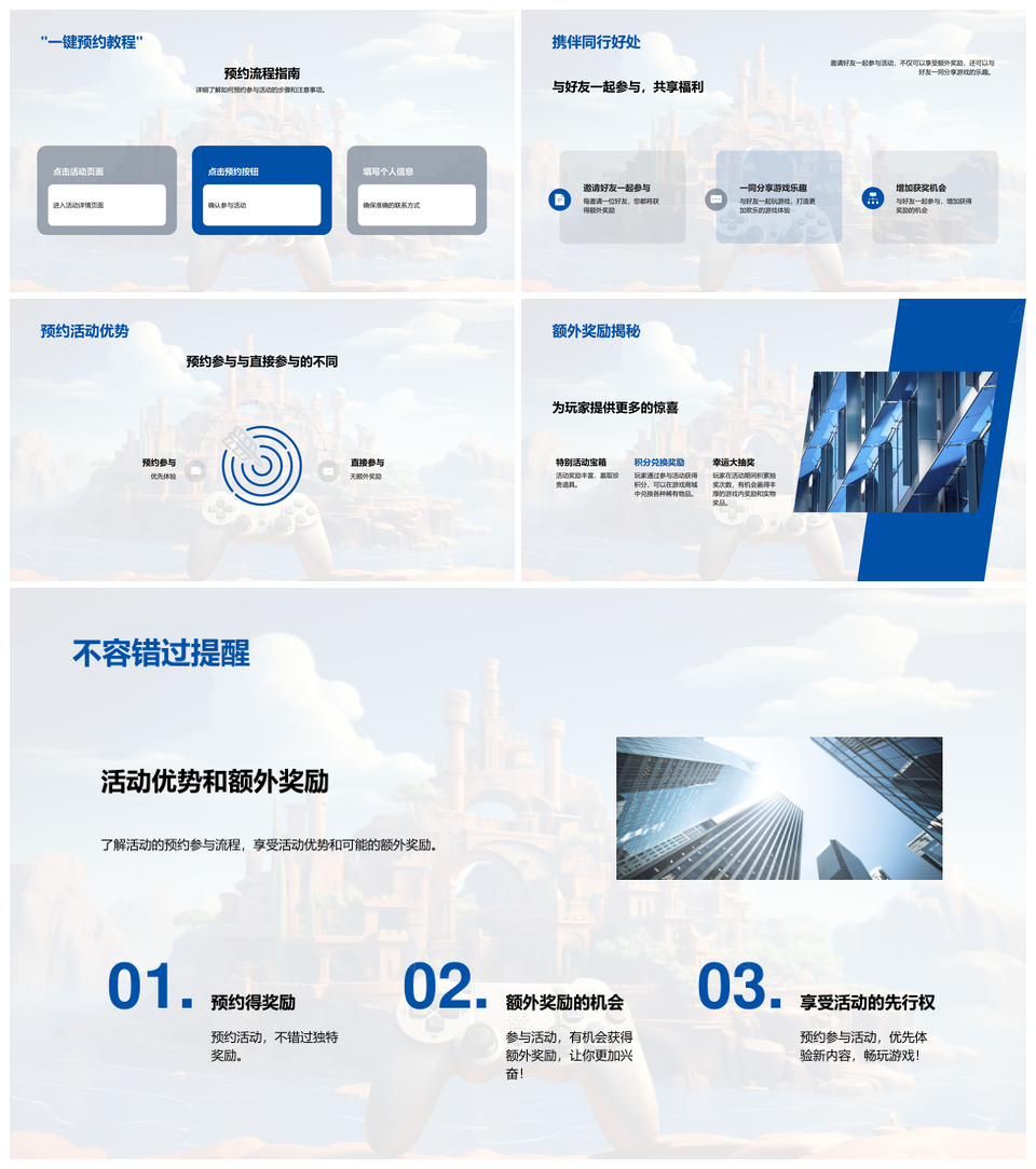 这是一张游戏活动策划激励创新与玩家心理奖励设计PPT模板,包含游戏、活动、策划、激励、创新、玩家、心理、奖励、设计等主题内容,也可用作游戏活动策划激励创新、策划激励创新玩家心理、激励创新玩家心理奖励设计、游戏活动策划激励、策划激励创新、激励创新玩家心理、创新玩家心理奖励设计、游戏活动策划、策划激励、激励创新、创新玩家心理、玩家心理奖励设计、策划玩家心理、激励奖励设计、创新奖励设计等PPT场景使用。 风云办公提供的游戏活动策划激励创新与玩家心理奖励设计PPT模板,下载格式为pptx,一共33页,作品中文字及图均可以修改和编辑,图片更改请在作品中右键图片并更换,文字修改请直接点击文字进行修改。
