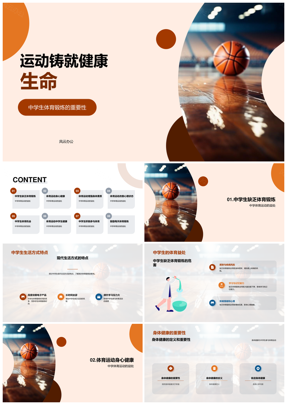 风云办公提供的中学生体育运动强身健心防常见疾病PPT模板,下载格式为pptx,一共33页,作品中文字及图均可以修改和编辑,图片更改请在作品中右键图片并更换,文字修改请直接点击文字进行修改。
