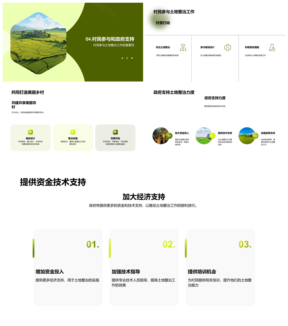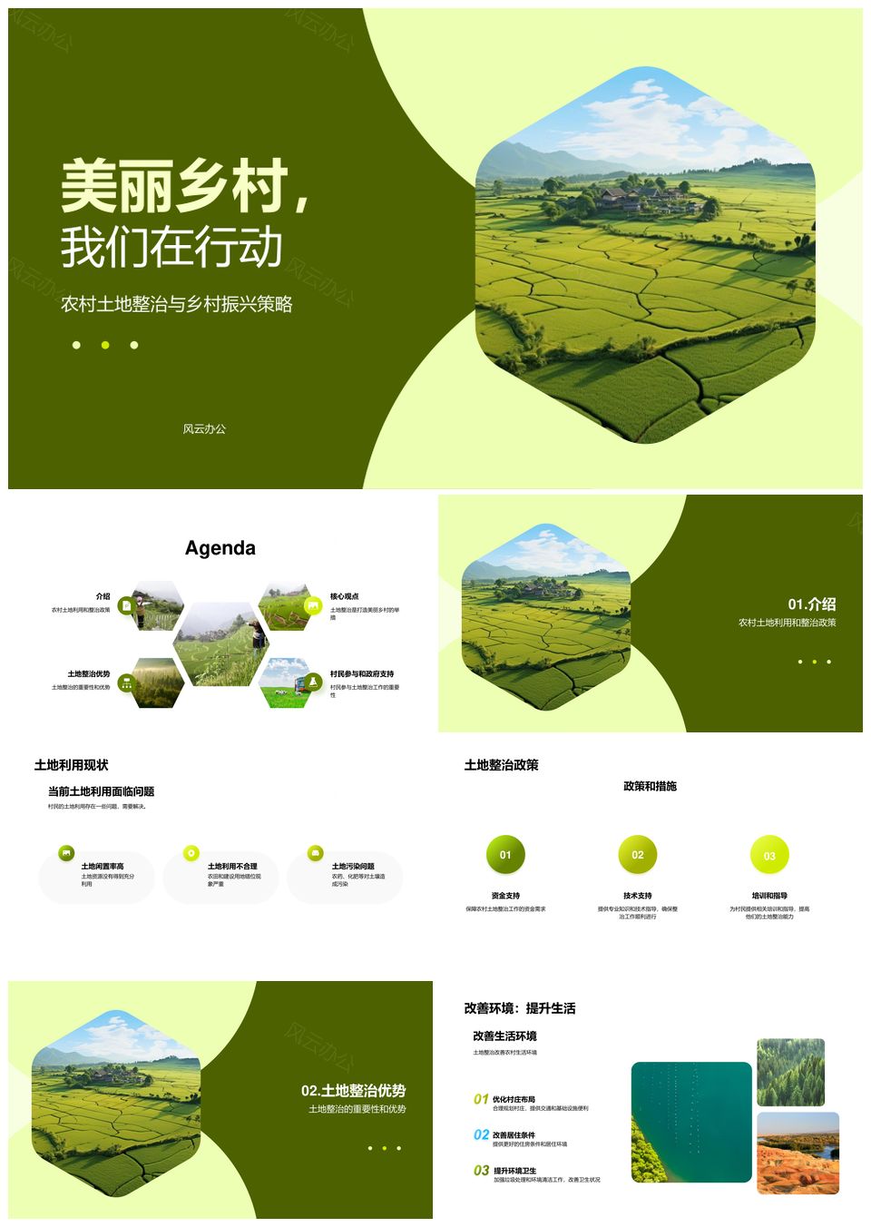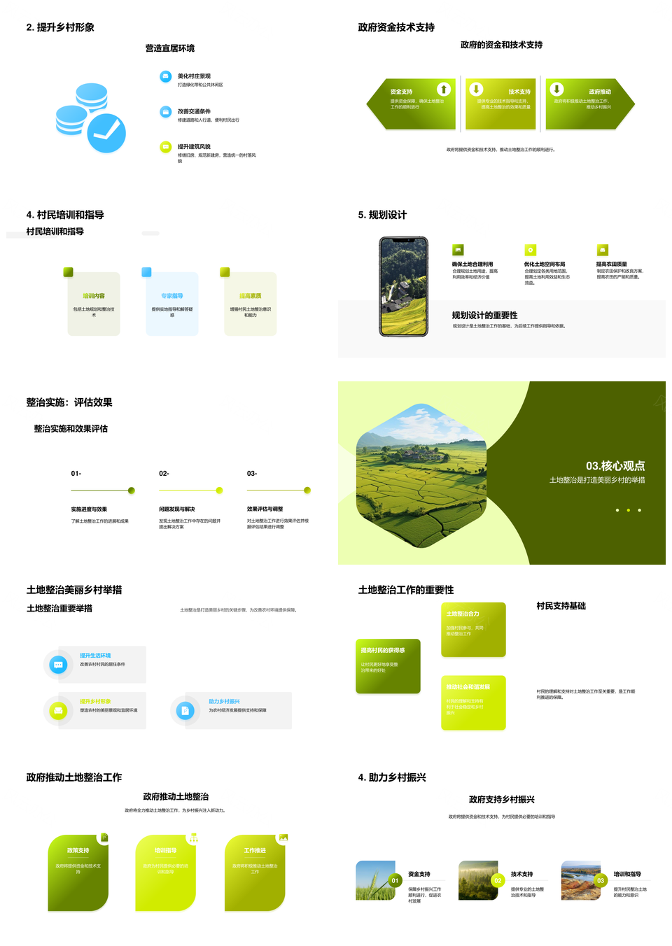 这是一张农村土地整治措施优化环境建设美丽乡村PPT模板,包含农村土地整治、措施、优化、环境建设、美丽乡村等主题内容,也可用作农村土地整治措施优化环境建设、农村土地整治措施、土地整治措施优化环境、整治措施优化环境建设、措施优化环境建设美丽、优化环境建设美丽乡村、农村土地整治、土地整治措施优化、整治措施优化环境、优化环境建设、环境建设美丽乡村、农村土地、土地整治、优化环境、美丽乡村等PPT场景使用。 风云办公提供的农村土地整治措施优化环境建设美丽乡村PPT模板,下载格式为pptx,一共23页,作品中文字及图均可以修改和编辑,图片更改请在作品中右键图片并更换,文字修改请直接点击文字进行修改。