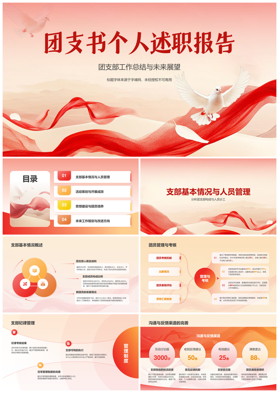 这是一张团支书述职支部建设与团队发展总结汇报PPT模板,包含团支书、述职、支部建设、团队发展、总结、汇报等主题内容,也可用作团支书述职支部建设、述职支部建设团队发展、支部建设团队发展总结、建设团队发展总结汇报、述职团队发展总结汇报、团支书述职总结汇报、支部建设团队发展、团支书支部建设团队、建设团队发展总结、团队发展总结汇报、团支书述职支部、述职支部建设、支部建设团队、建设团队发展、团队发展总结等PPT场景使用。 风云办公提供的团支书述职支部建设与团队发展总结汇报PPT模板,下载格式为pptx,一共25页,作品中文字及图均可以修改和编辑,图片更改请在作品中右键图片并更换,文字修改请直接点击文字进行修改。