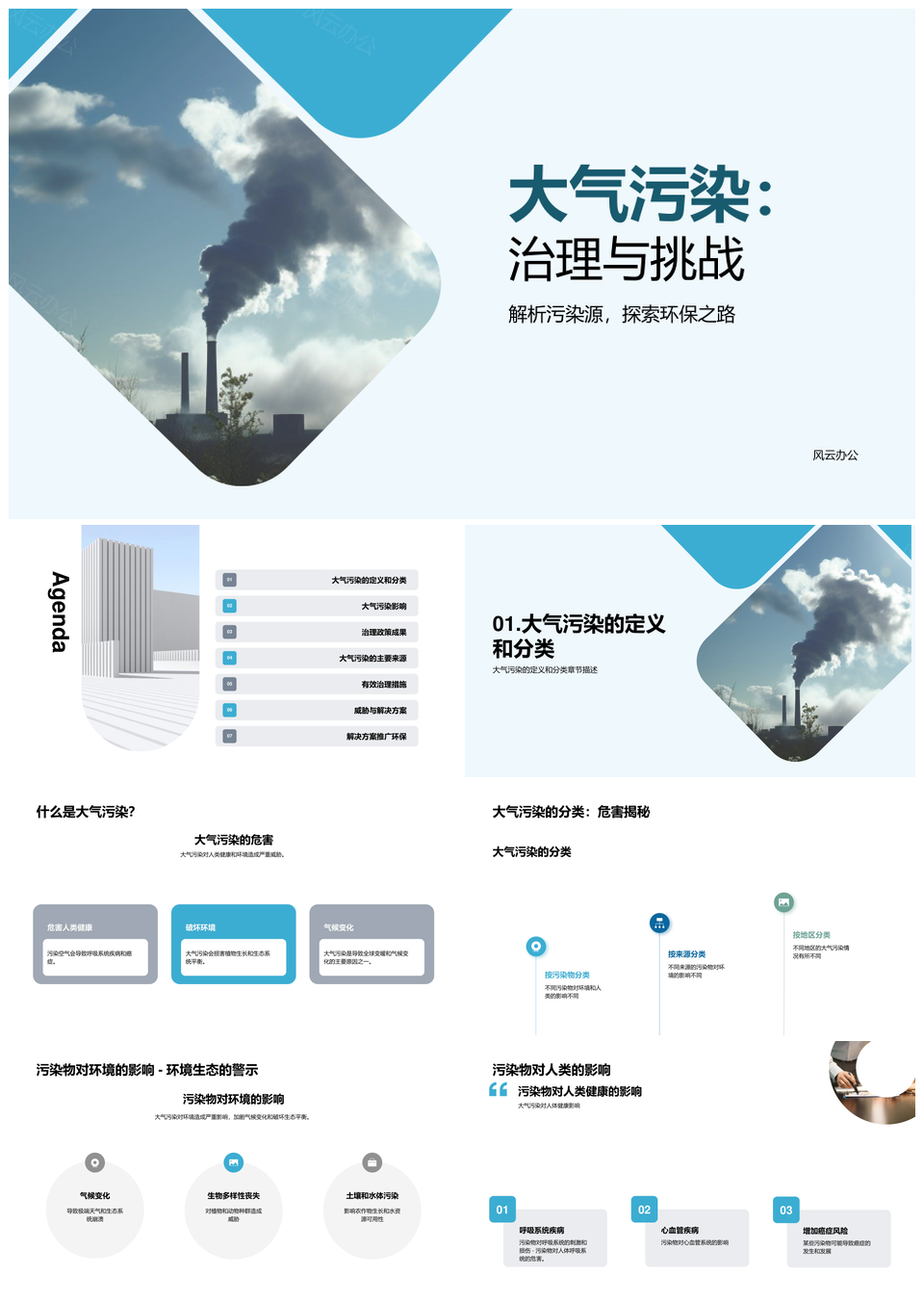 风云办公提供的大气污染治理对策影响健康与环境PPT模板,下载格式为pptx,一共33页,作品中文字及图均可以修改和编辑,图片更改请在作品中右键图片并更换,文字修改请直接点击文字进行修改。