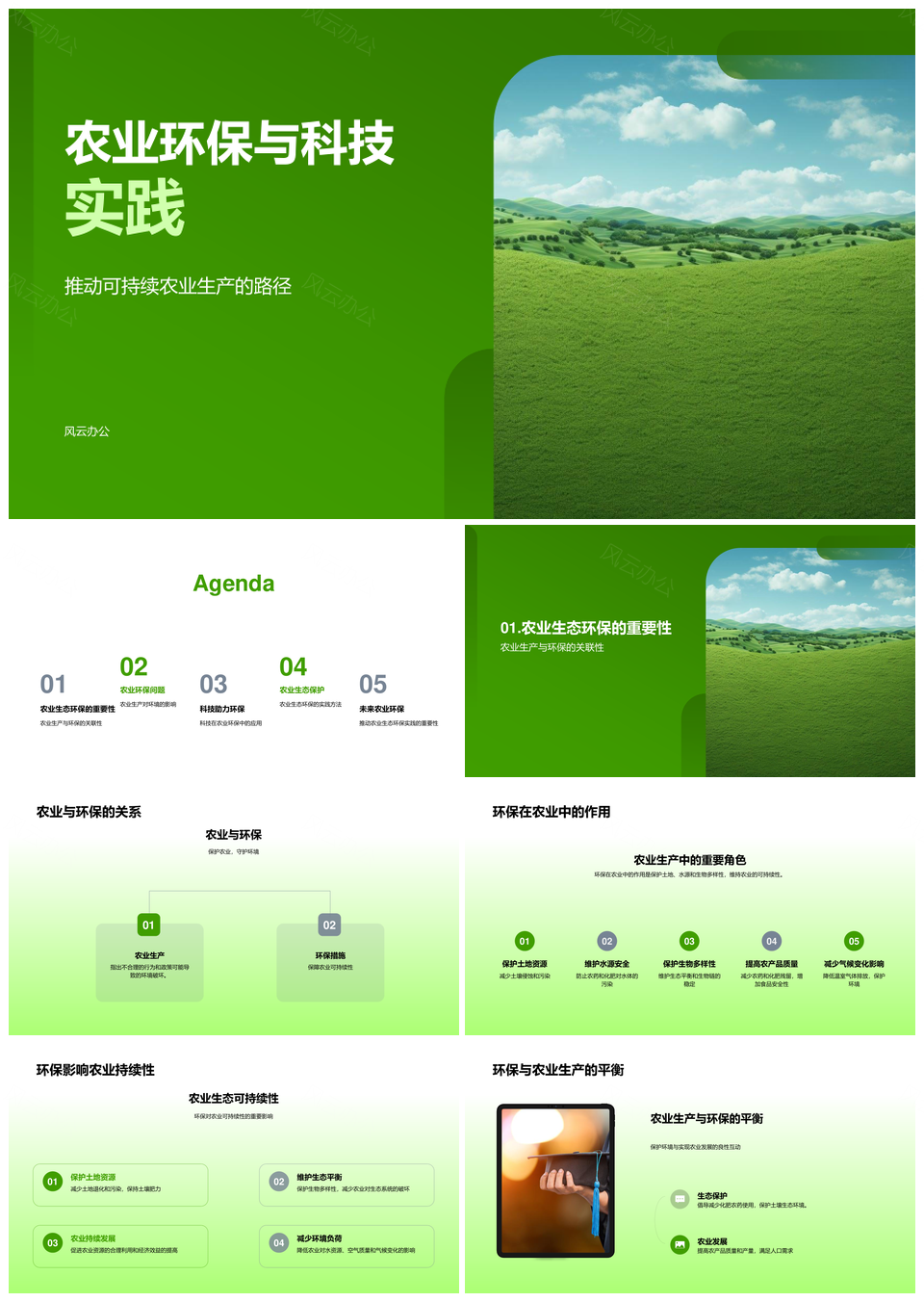 风云办公提供的农业生态环保科技实践可持续农业PPT模板,下载格式为pptx,一共33页,作品中文字及图均可以修改和编辑,图片更改请在作品中右键图片并更换,文字修改请直接点击文字进行修改。