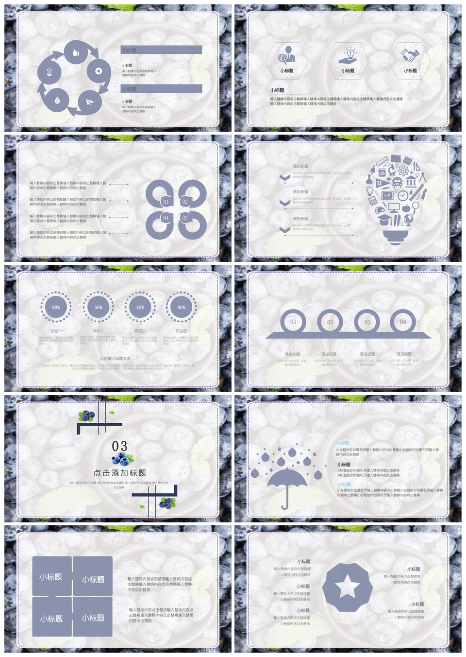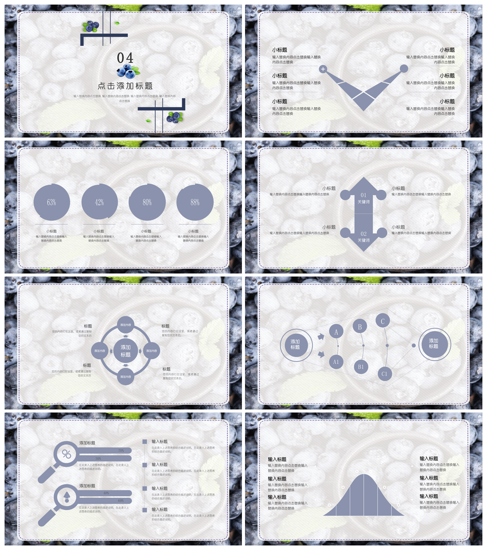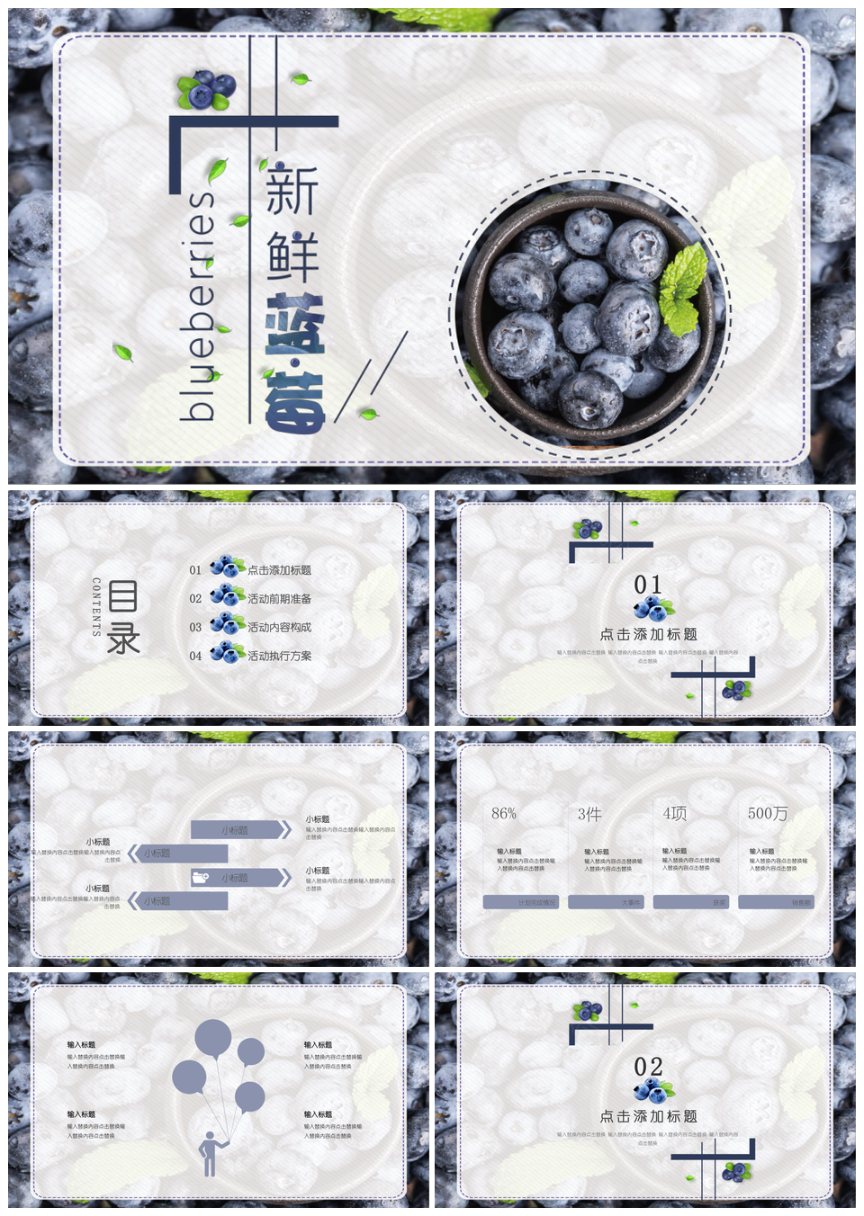 这是一张蓝莓新鲜小清新通用PPT模板,包含蓝莓、新鲜、小清新等主题内容,也可用作蓝莓、新鲜、小清新 蓝莓新鲜小清新、蓝莓新鲜、蓝莓小清新、新鲜小清新等PPT场景使用。 风云办公提供的蓝莓新鲜小清新通用PPT模板,下载格式为pptx,一共1页,作品中文字及图均可以修改和编辑,图片更改请在作品中右键图片并更换,文字修改请直接点击文字进行修改。